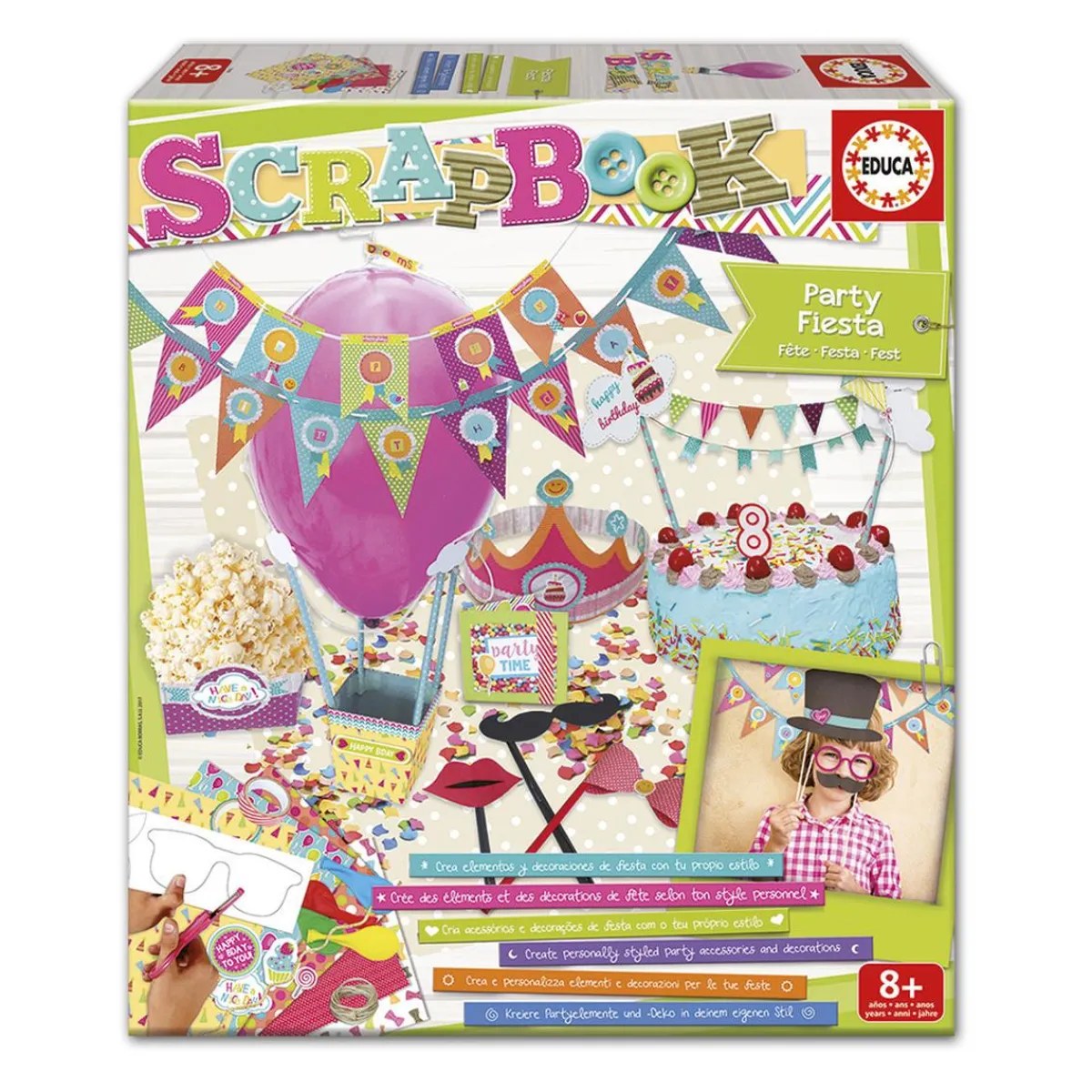 Educa Borrás – Party Fiesta Scrapbook, un set para crear elementos y decoraciones de fiesta con estilo propio. Incluye todo el material necesario para realizar fantásticas creaciones de arte floral (flores, cestas, macetas, …), un fantástico libro de manualidades y video-tutoriales. Sin cola. ¡Creatividad al poder! La manualidad de moda. Edad recomendada: +6 años.
