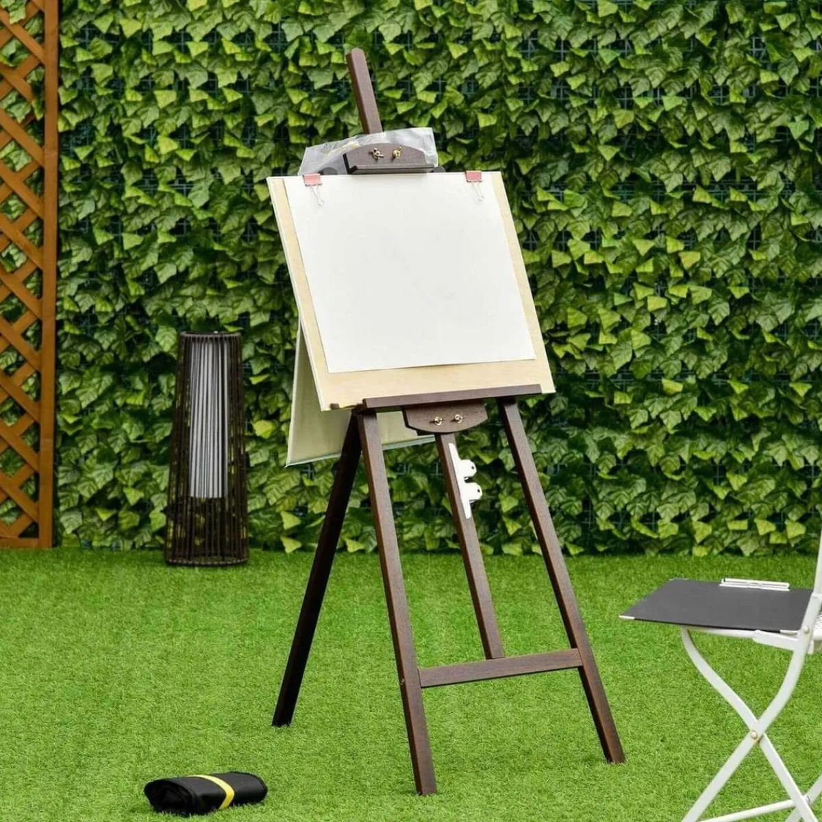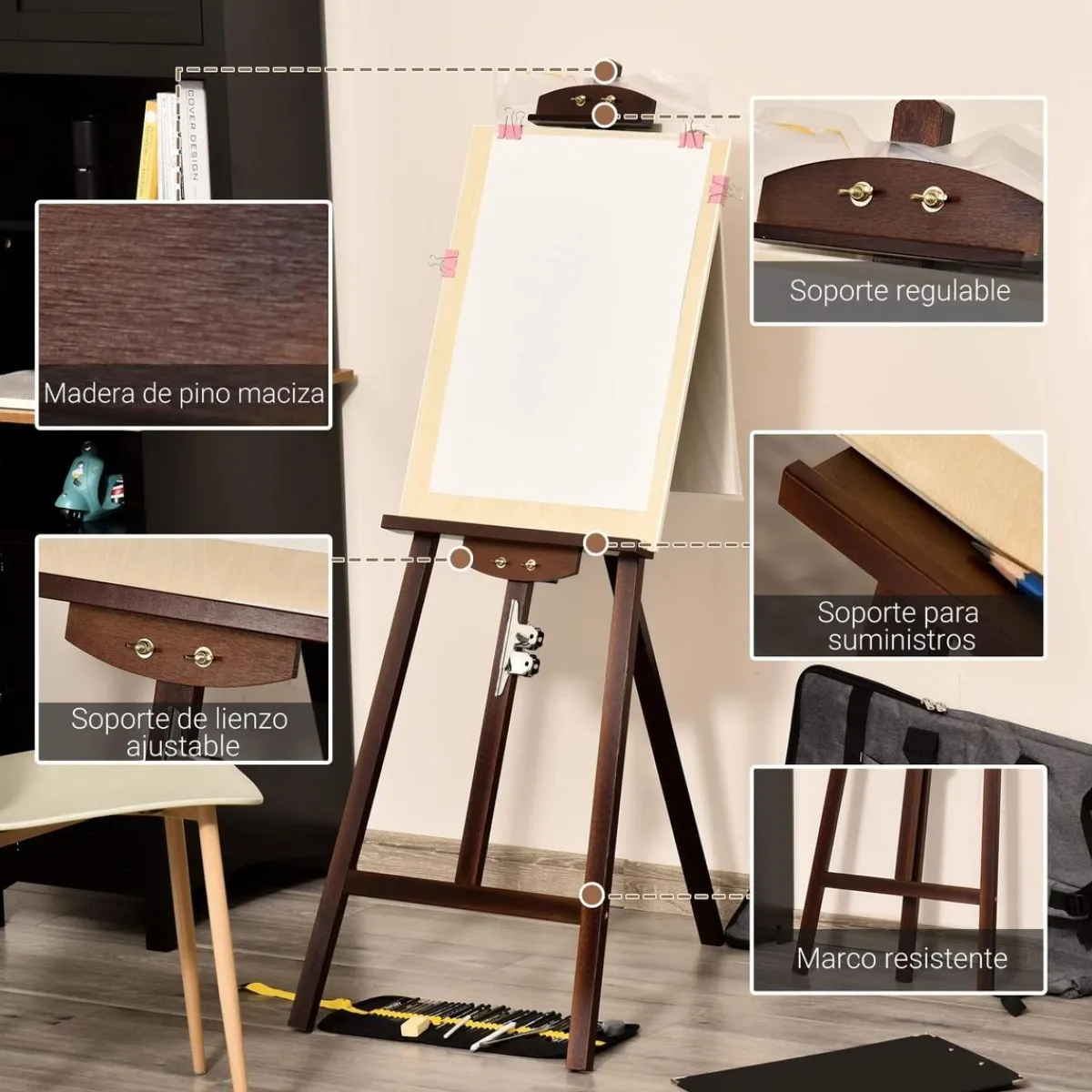 - Buenos acabados. Caballete fabricado en madera de pino. Ofrece un soporte resistente y duradero, con superficie lisa y pulida. Incluye un pincel.