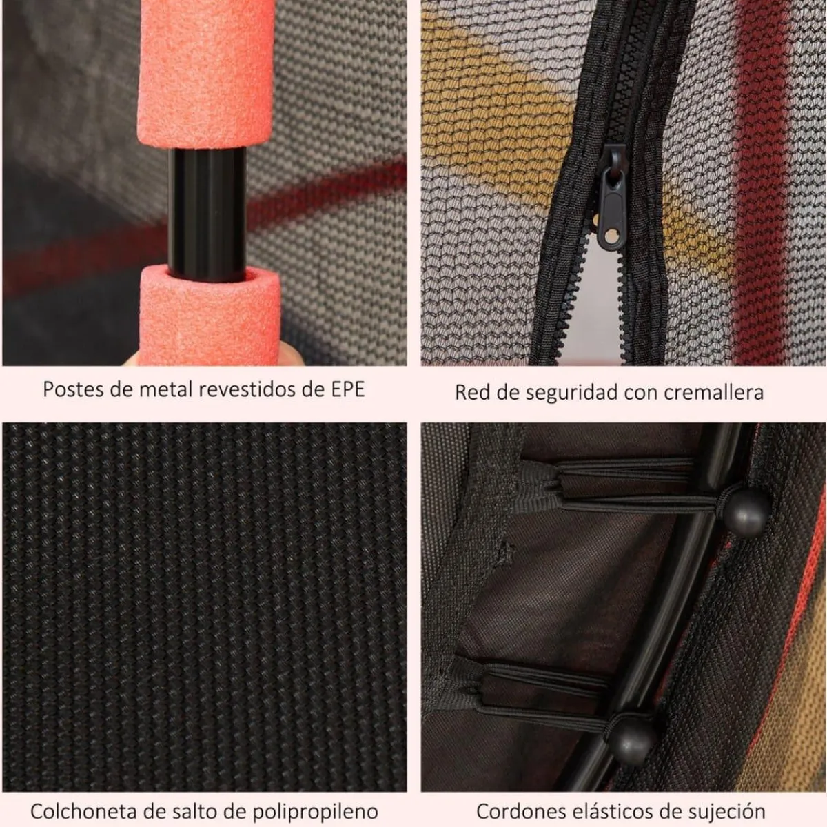 - Incluye una red alrededor de las patas para evitar que ni los niños ni las mascotas se metan debajo del trampolín.