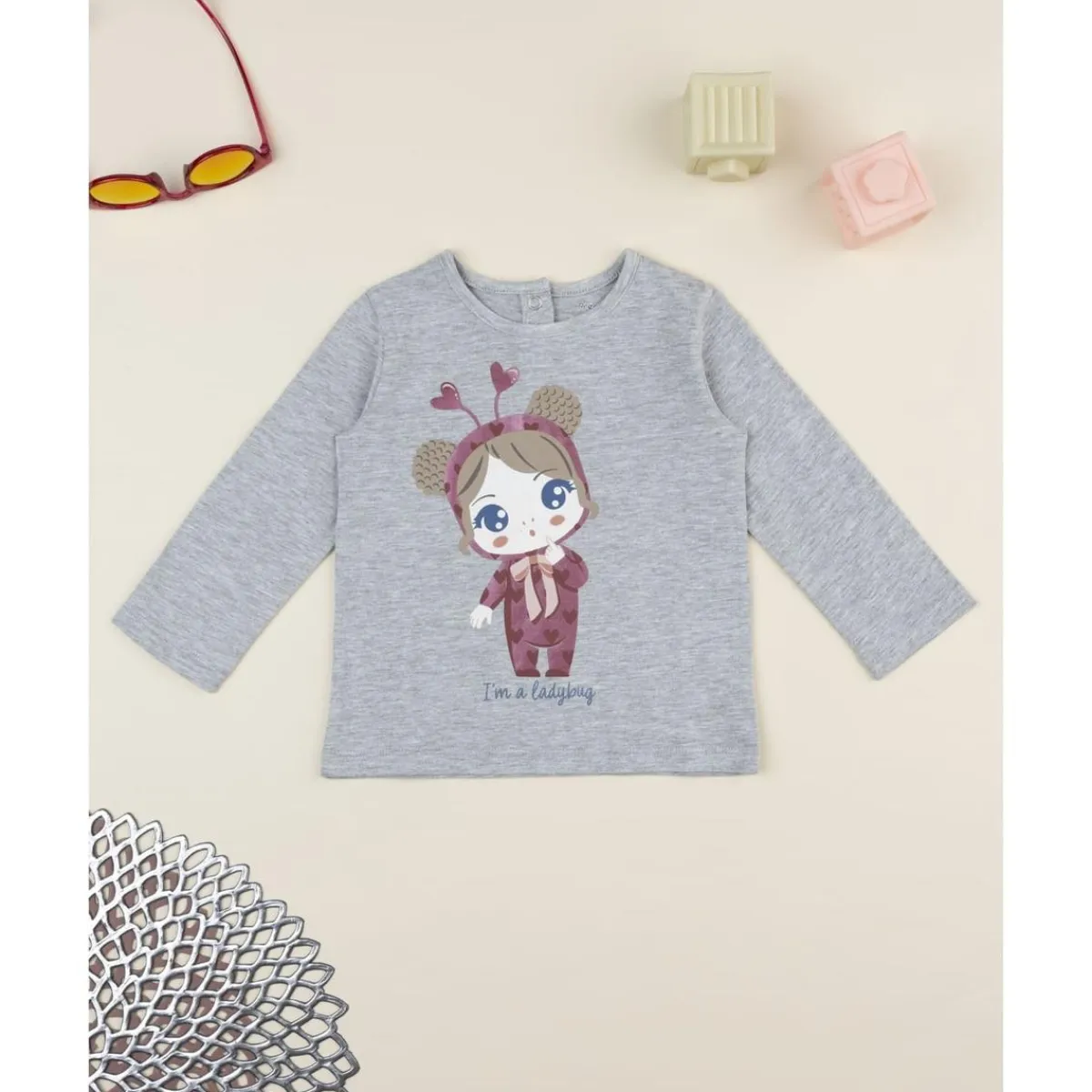 La camiseta gris con estampado es una prenda versátil y cómoda para las más pequeñas. Confeccionada en algodón suave, ofrece transpirabilidad y confort durante todo el día. De color gris claro y estampado decorativo, cuenta con botones automáticos en la espalda para facilitar el vestir.