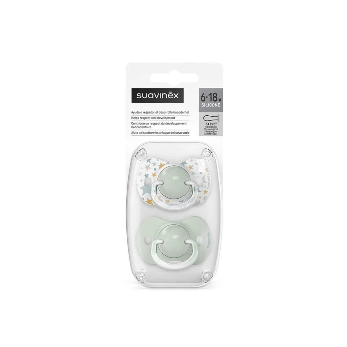 El pack de 2 chupetes Suavinex con tetina simétrica de silicona SX Pro está diseñado para proporcionar a tu bebé una sensación lo más natural posible. La tetina simétrica SX Pro respeta el desarrollo de la cavidad bucal del bebé al no invadirla.