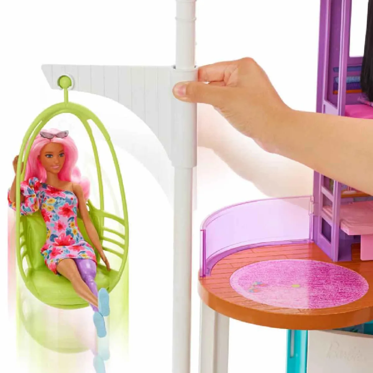 La casa de 2 pisos cuenta con dormitorio, baño, cocina, comedor, sala de estar y armario con acabados modernos y el estilo emblemático de Barbie.