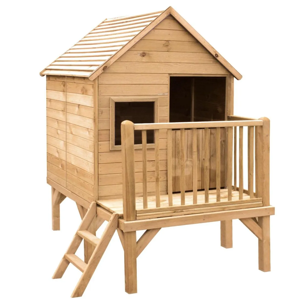 Incluye anclajes para el suelo. Esta casita elevada cuenta con una escalera para acceder y un balcón.