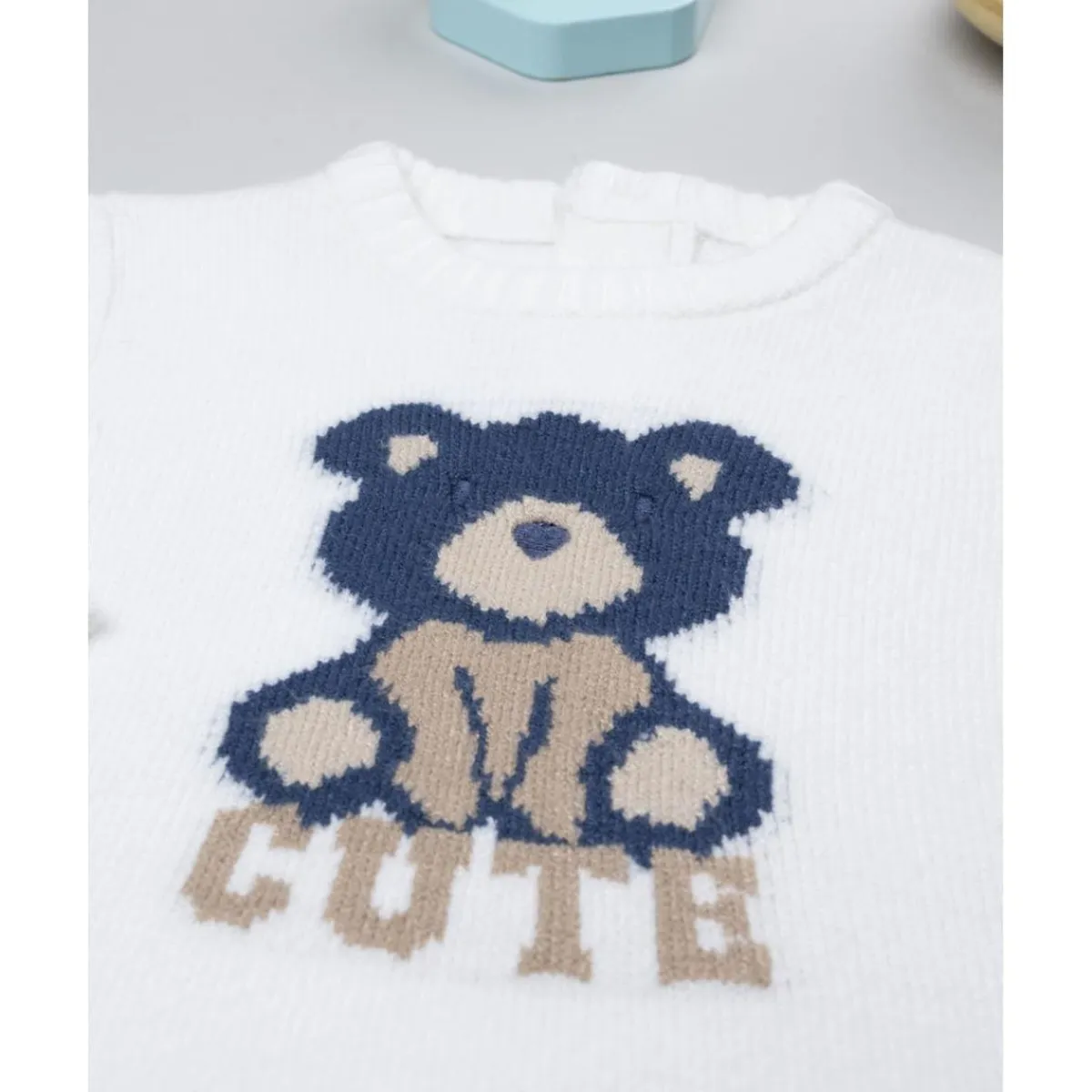 Jersey de punto blanco con diseño tejido de osito en azul y beige. Ajuste cómodo con botones en la espalda. Ideal para looks casuales.