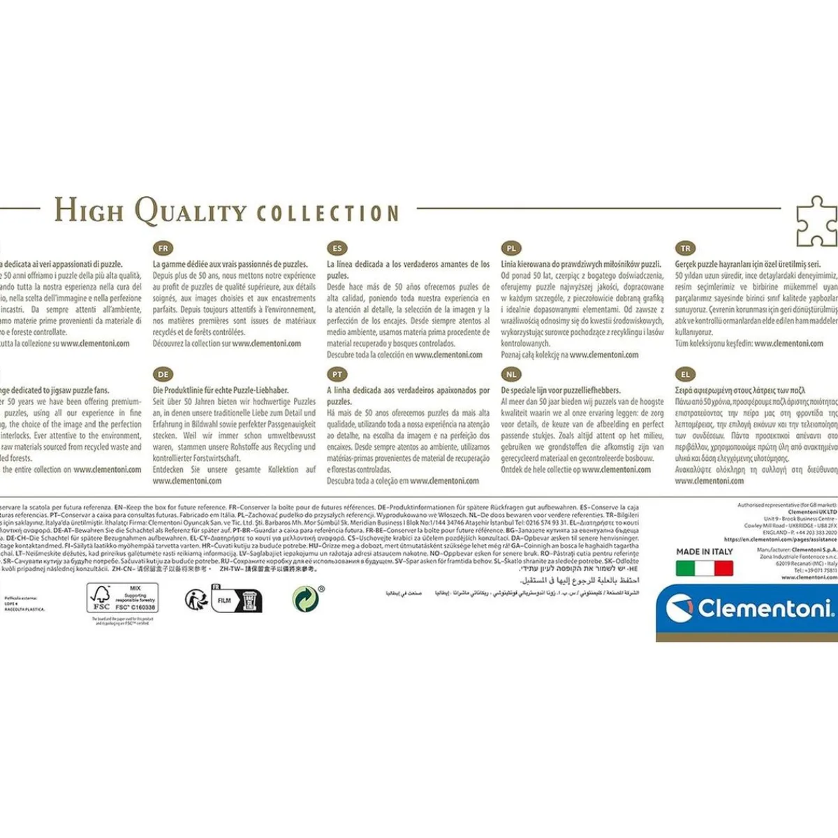 Este puzzle ha sido fabricado en Italia, siguiendo los más altos estándares de calidad para garantizar que cada pieza encaje a la perfección. Confía en Clementoni, una marca con tradición y prestigio.
