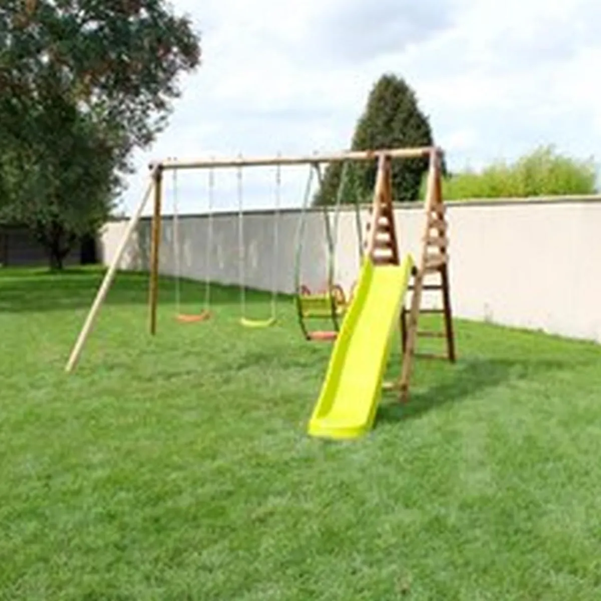 Se trata de un columpio de madera tratada con autoclave IV marrón. Es ideal para una casa con jardín, y para peques de 3 a 12 años.