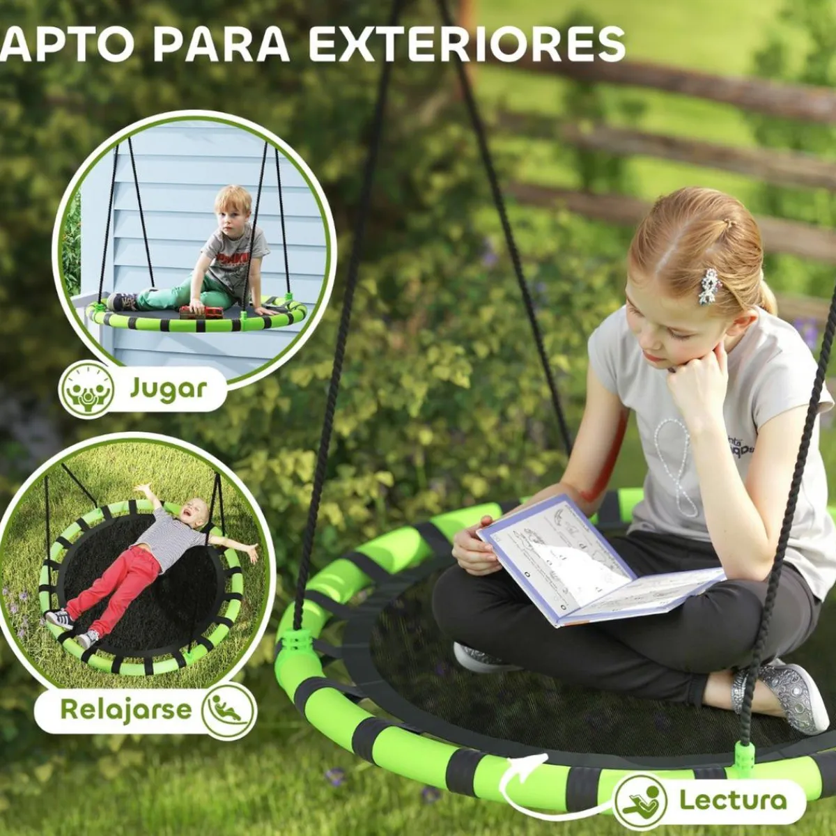 - Columpio exterior soporta hasta 150 kg, proporcionando una experiencia de balanceo segura y estable