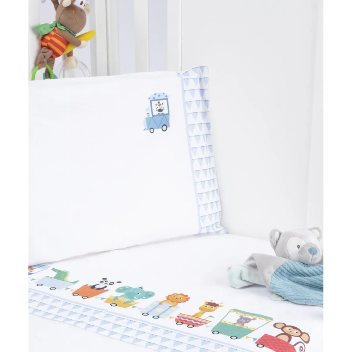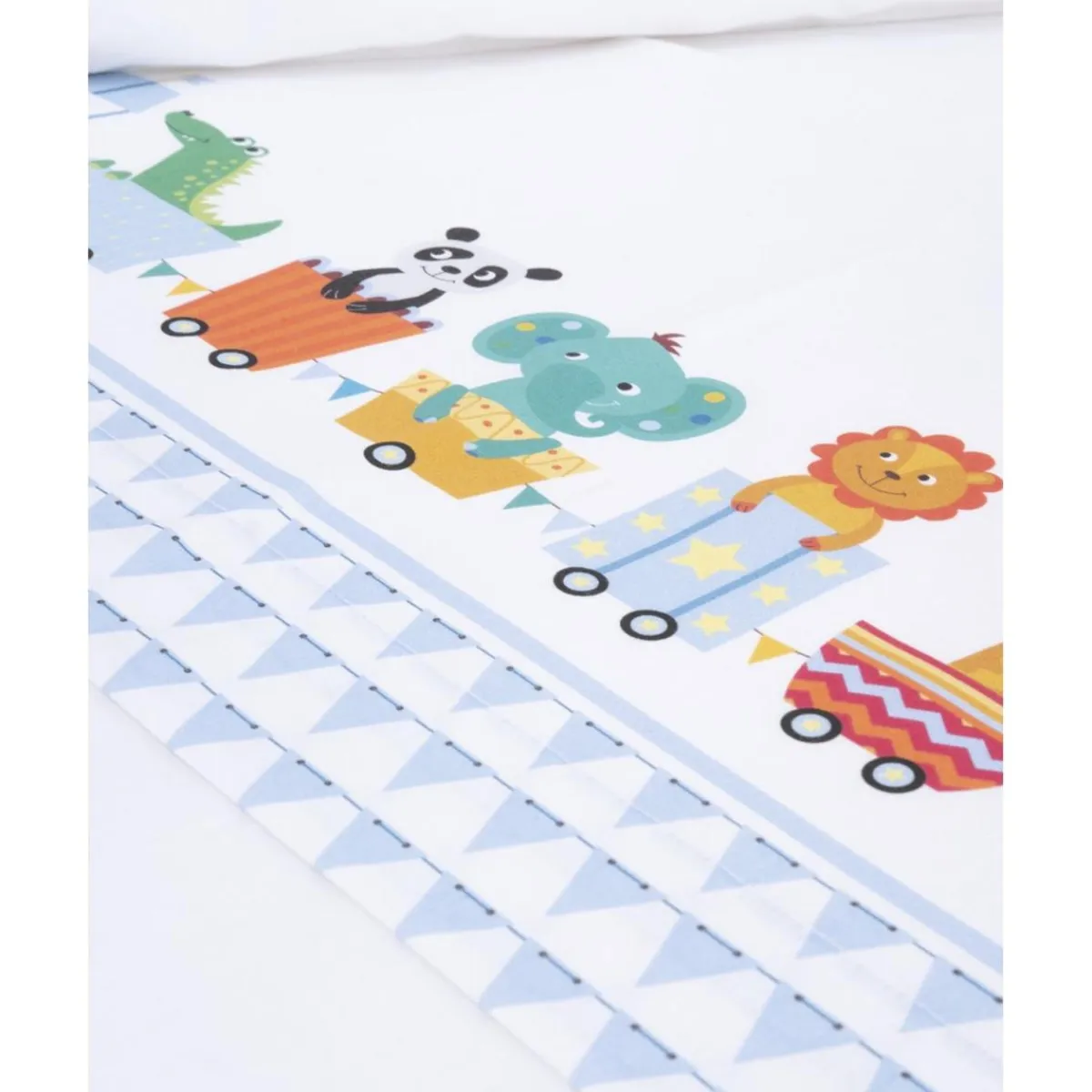Este encantador conjunto de cuna unisex de 3 piezas está confeccionado en 100% algodón, asegurando la máxima suavidad y comodidad para el descanso de tu bebé. El diseño presenta un fondo azul claro adornado con un estampado completo de pequeños triángulos en azul intenso. En el centro, destaca una alegre ilustración de trenecitos coloridos acompañados de simpáticos animalitos de la jungla en tonos vibrantes. Este set es delicado y manejable, ideal para vestir la cuna de tu pequeño con estilo y ternura.