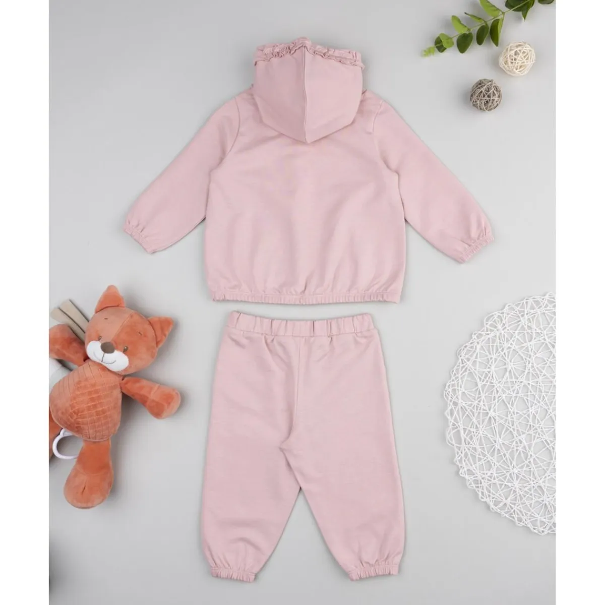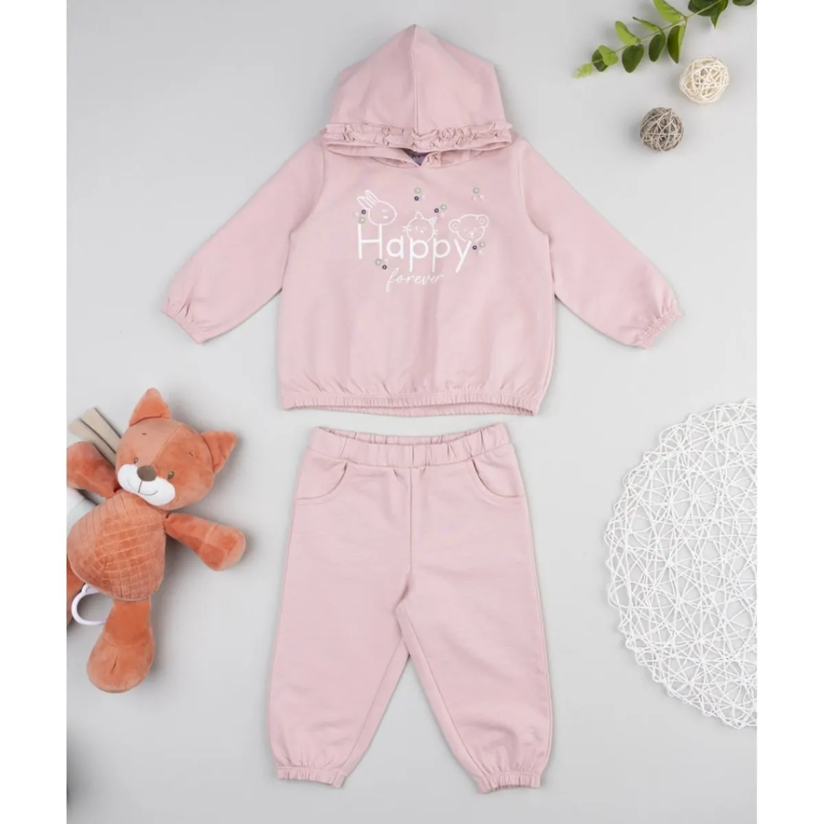 Adorable conjunto de dos piezas sin forro interior. Incluye sudadera con capucha rosa y frase “happy forever” al frente, y pantalón a juego con cintura elástica para mayor comodidad. Ideal para días de juego o paseos casuales.