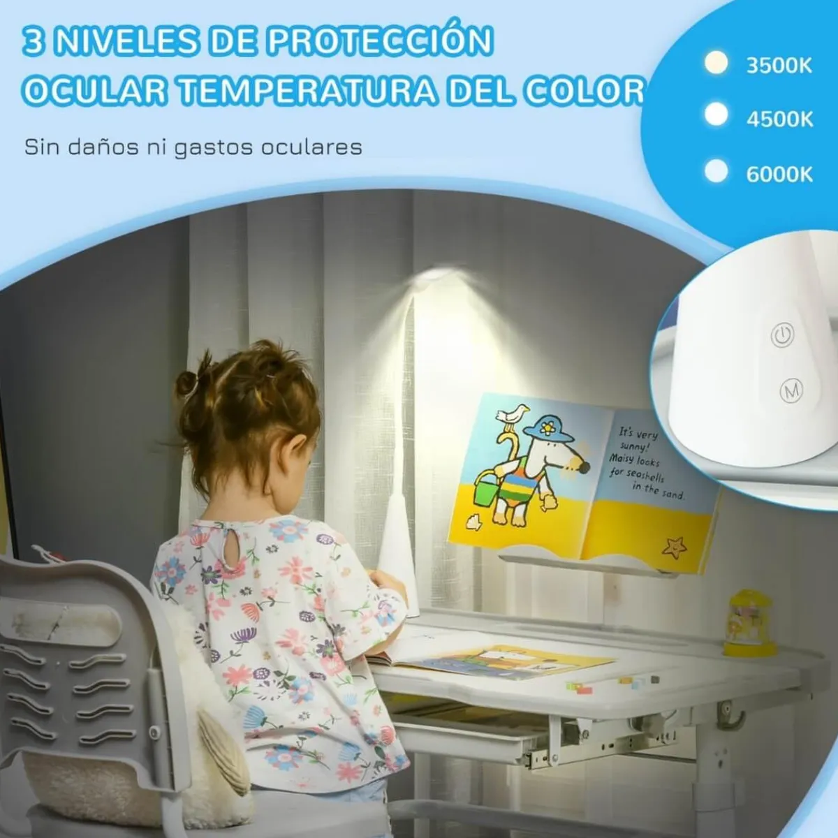- El escritorio infantil incluye un cajón, 2 ranuras para bolígrafos, un portavasos, un tablero de lectura, una lámpara LED y un lapicero.