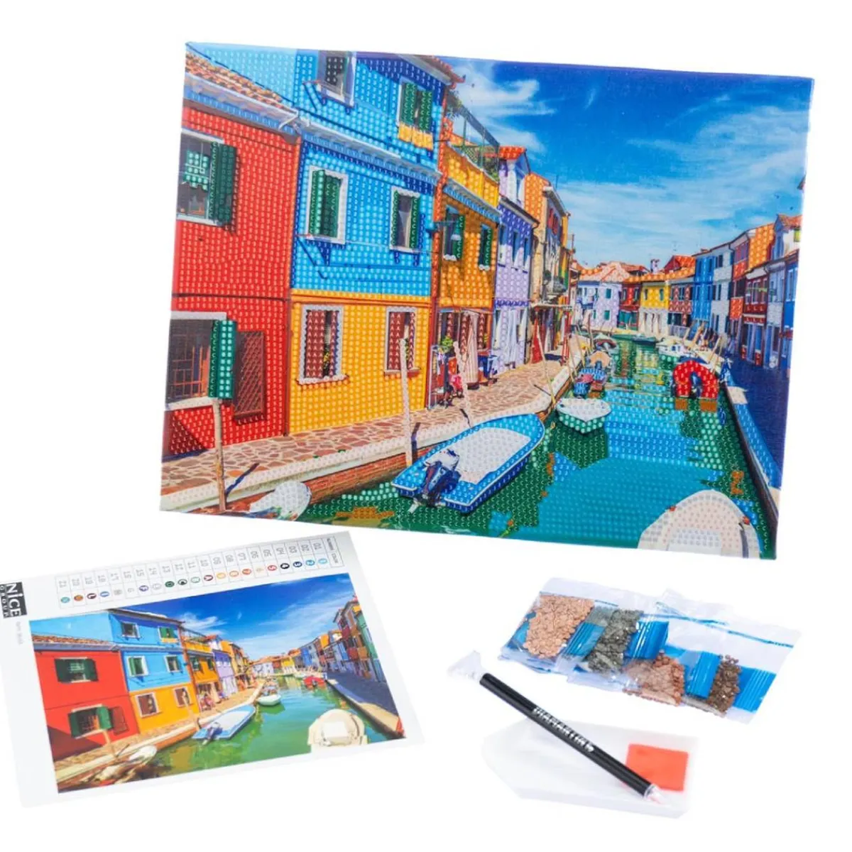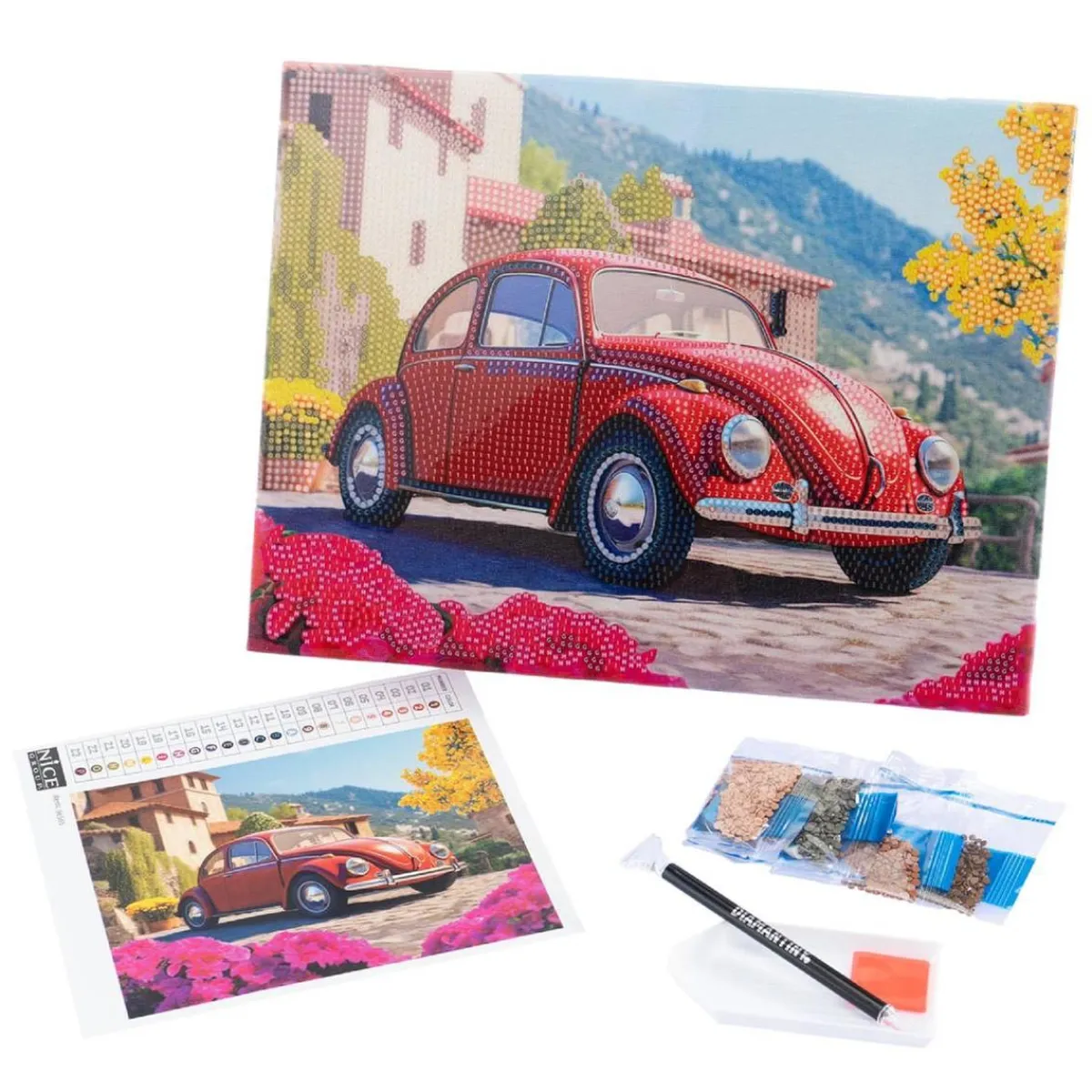 Incluye un lienzo de lona con diseño, cristales de colores, una bandeja organizadora y una práctica herramienta aplicadora. La tela sobre la que se aplican las gemas está soportada por un tablero rígido para permitir una perfecta adherencia de las gemas.