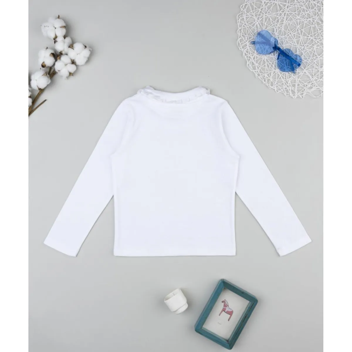 Elegante camiseta de cuello alto para niña en color blanco, decorada con lazo azul de lentejuelas en el pecho. Su diseño sencillo y el tejido suave hacen de esta prenda un básico ideal para cualquier conjunto.