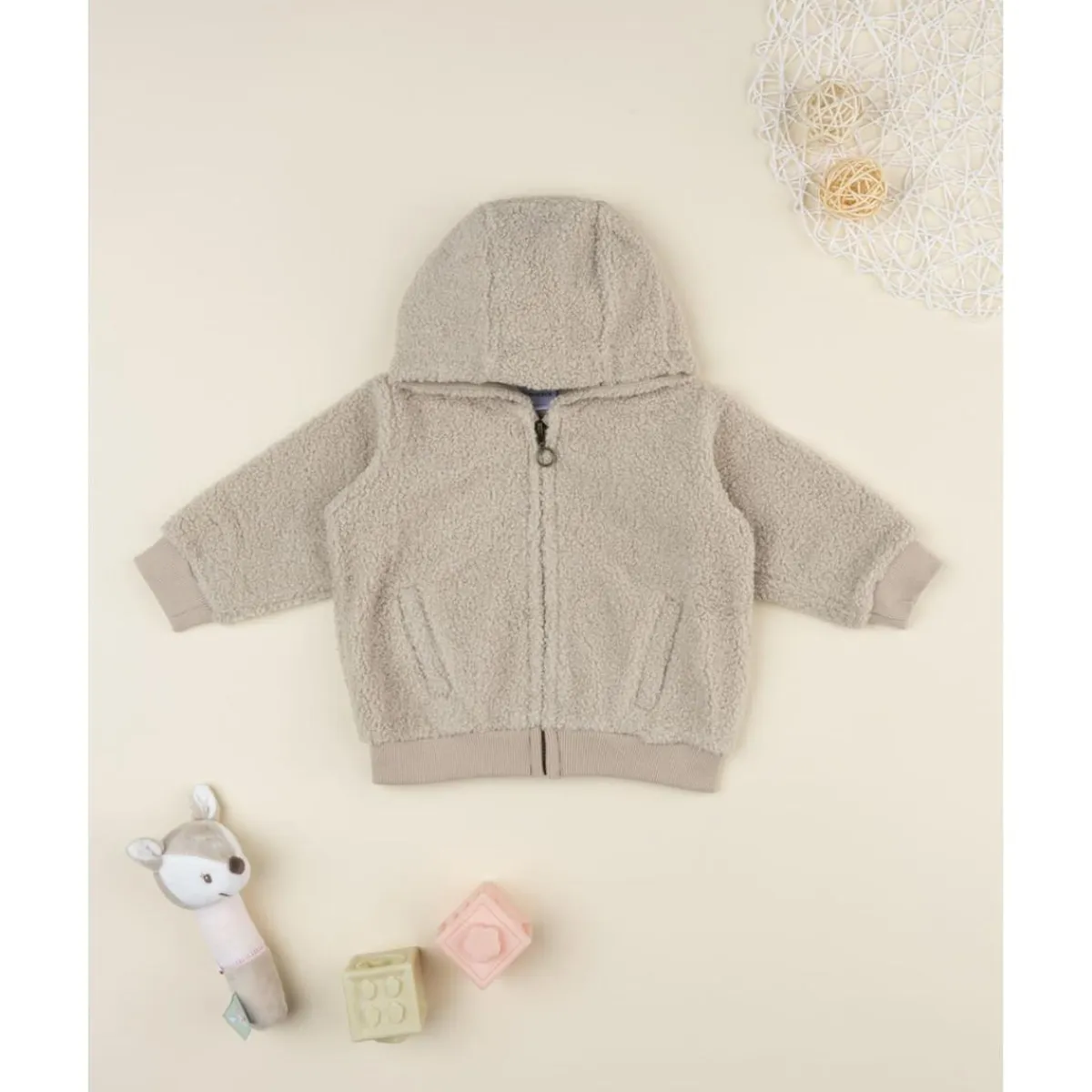 Cardigan cálido de efecto peluche para bebé, en beige liso y con capucha para abrigar cabeza y orejitas. Cierra con cremallera frontal para vestir rápido, y remata con puños y bajo elásticos que ayudan a conservar el calor sin perder movilidad. Los bolsillos delanteros aportan un toque práctico y estético, perfecto para completar conjuntos de paseo o de guardería.