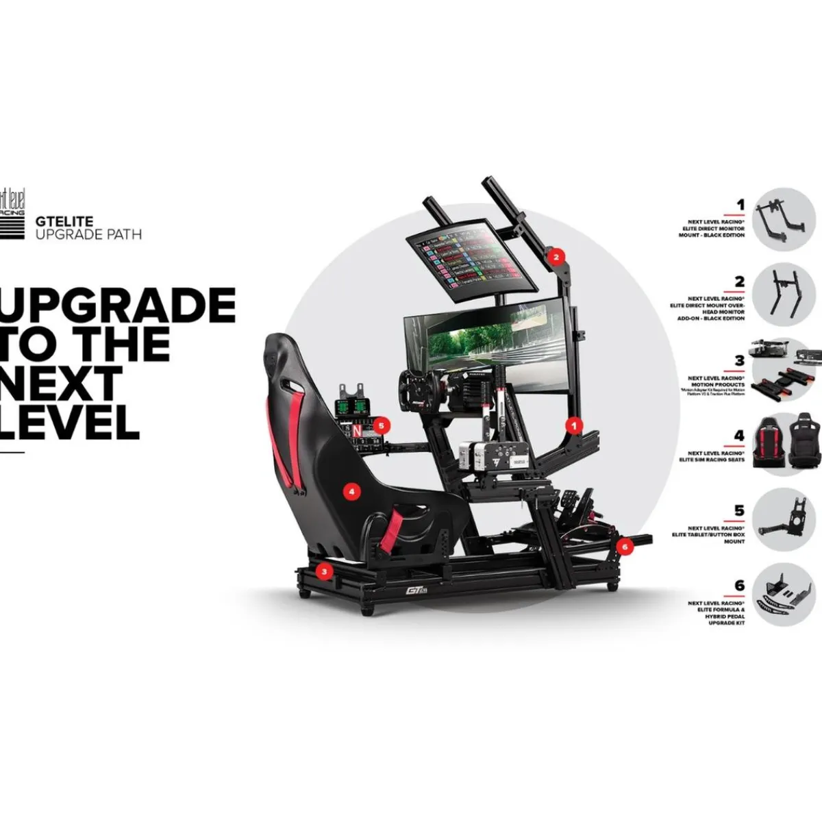 - Completa y mejora tu ecosistema GT Elite. GT Elite de Next Level Racing puede actualizarse dentro de la serie Elite para adaptarse a las necesidades de carrera de cada piloto. Por ejemplo, comprando el kit adaptador de movimiento GTElite de Next Level Racing, el Cockpit GT Elite puede ser compatible con las distintas plataformas de movimiento existentes y accesorios combinables. El Wheel Plate Cockpit también puede convertirse en una cabina de posición de carreras de Fórmula o Híbrida con la adición del Kit de Actualización de Pedales de Fórmula e Híbrida de Next Level Racing GT Elite. Con un creciente ecosistema de accesorios en la serie Elite, los usuarios pueden crear una experiencia completa de carreras añadiendo accesorios como los soportes para monitores, bandejas para teclados y ratones, soportes para tabletas y soportes para Realidad Virtual.