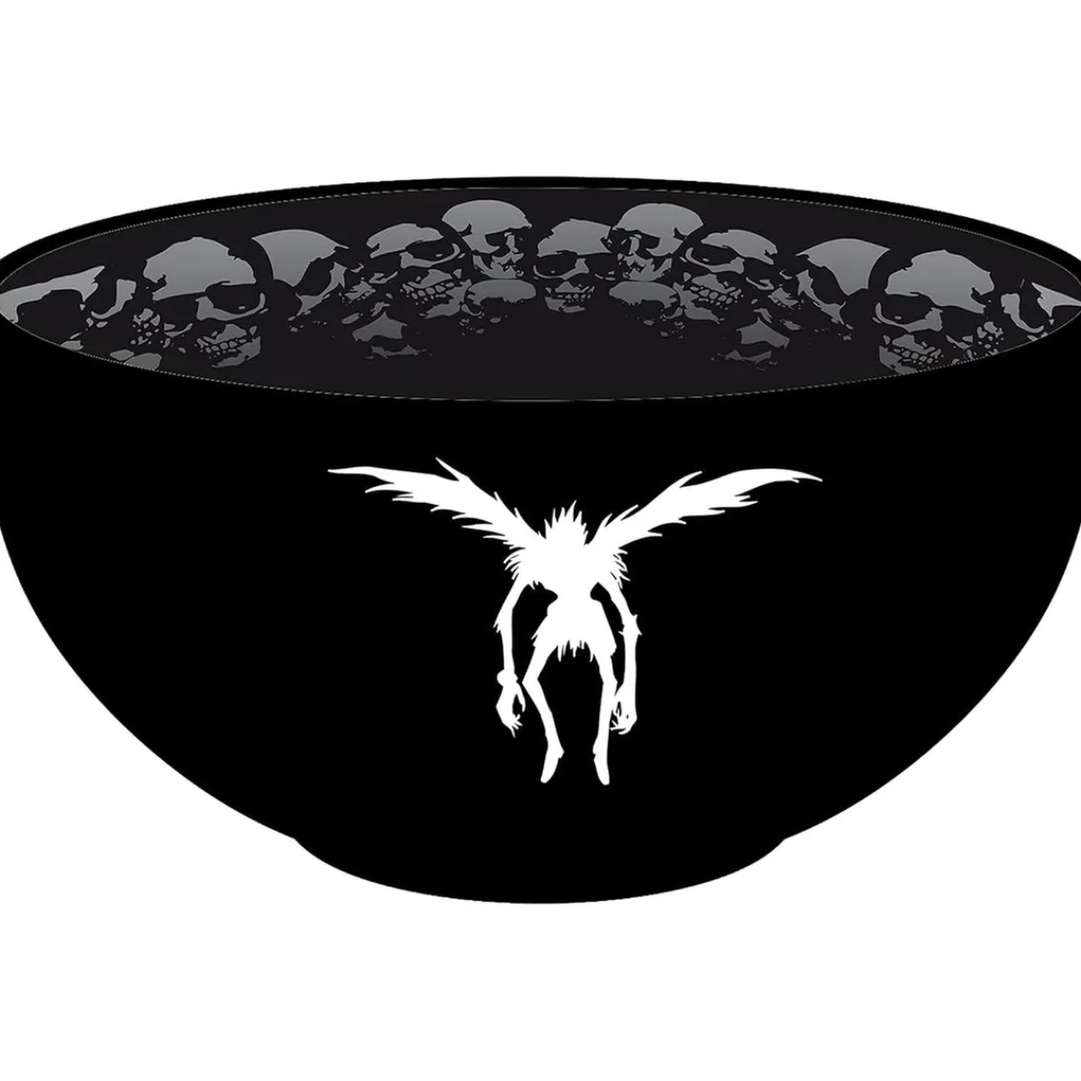 Con un elegante color negro, este cuenco presenta el icónico logo de Death Note a un lado, mientras que el otro está adornado con la enigmática silueta de Ryuk. Pero la sorpresa no termina ahí, ya que en el interior encontrarás un fascinante diseño repleto de calaveras y, en el fondo, ¡esas emblemáticas manzanas rojas que tanto le gustan a Ryuk! Cada vez que uses tu Cuenco Death Note, estarás descubriendo nuevos detalles que te conectarán con la serie.
