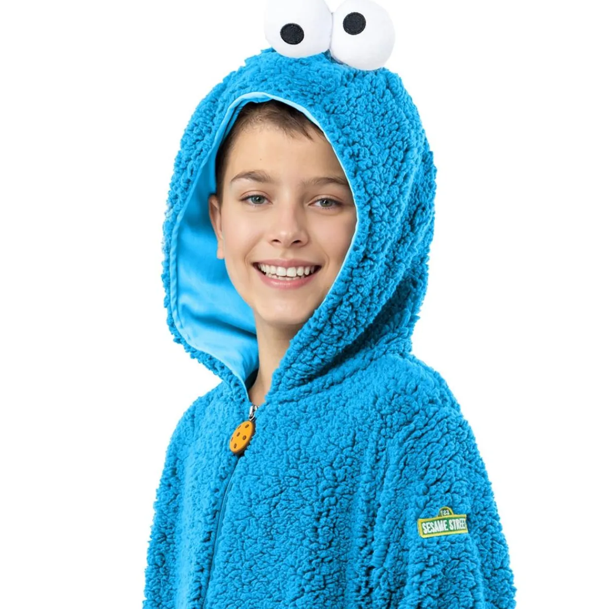 Este disfraz en talla 3-4 años transforma a los más pequeños en el divertido Monstruo de las Galletas. Incluye un mono con capucha en poliéster polar azul suave y cálido, con capucha bordada que representa los ojos saltones del personaje. Su corte holgado lo hace cómodo y práctico, ideal para juegos en casa, carnavales o fiestas infantiles. Es un disfraz simpático y entrañable, perfecto para crear recuerdos memorables.