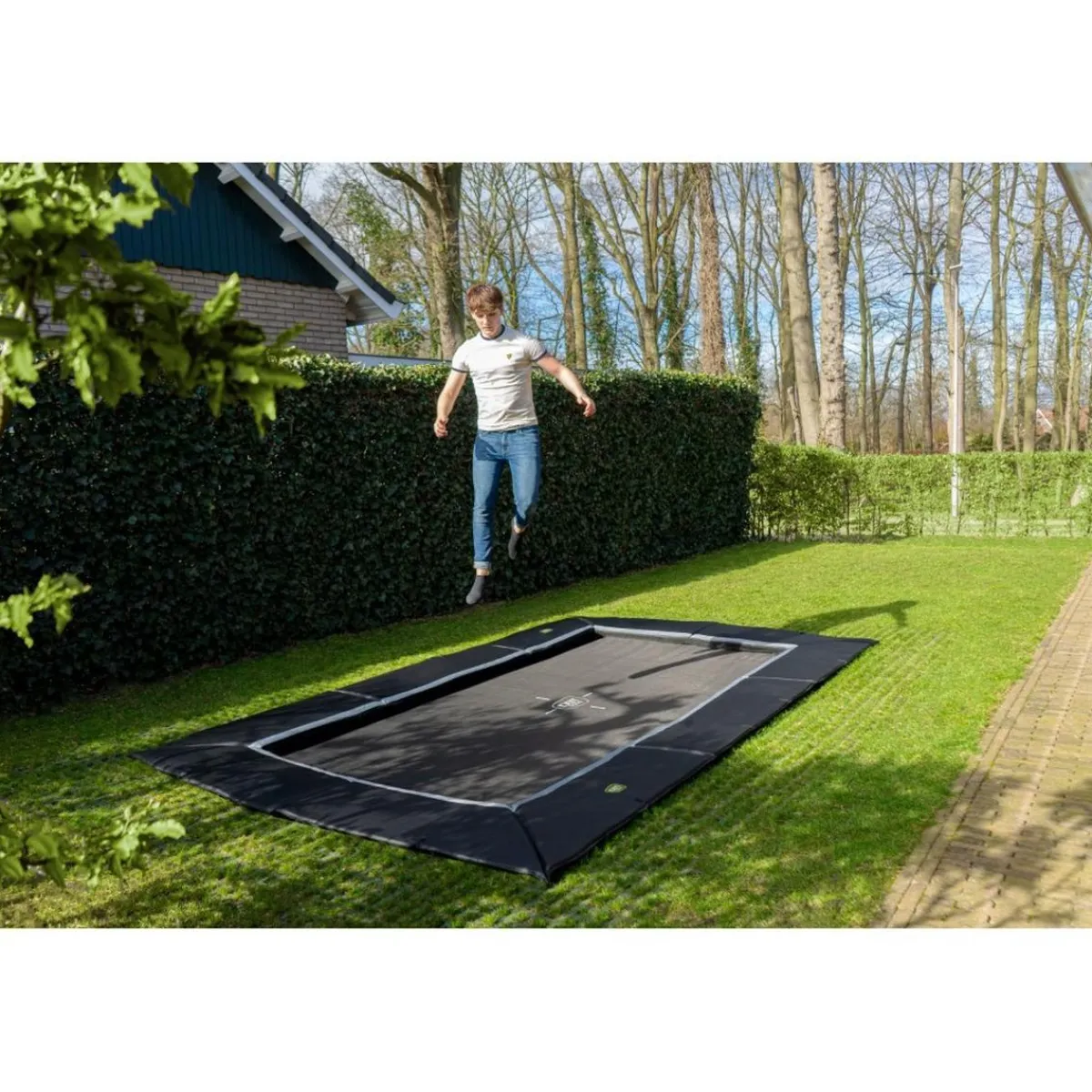 El trampolín Dynamic se instala a nivel del suelo completamente enterrado. El protector acolchado está al mismo nivel que el césped, por lo que el trampolín está totalmente integrado en el resto del jardín.