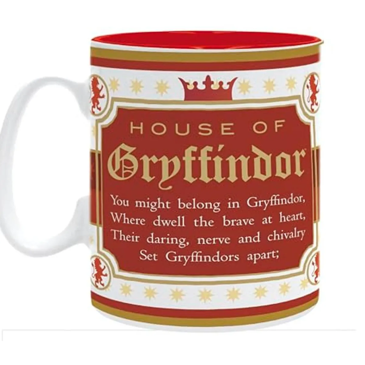 La taza resplandece con los colores característicos de Gryffindor: un vibrante escarlata y un dorado brillante. Este diseño único no solo es un homenaje visual a una de las casas más queridas de Hogwarts, sino que también es una pieza indispensable para cualquier colección de Harry Potter.