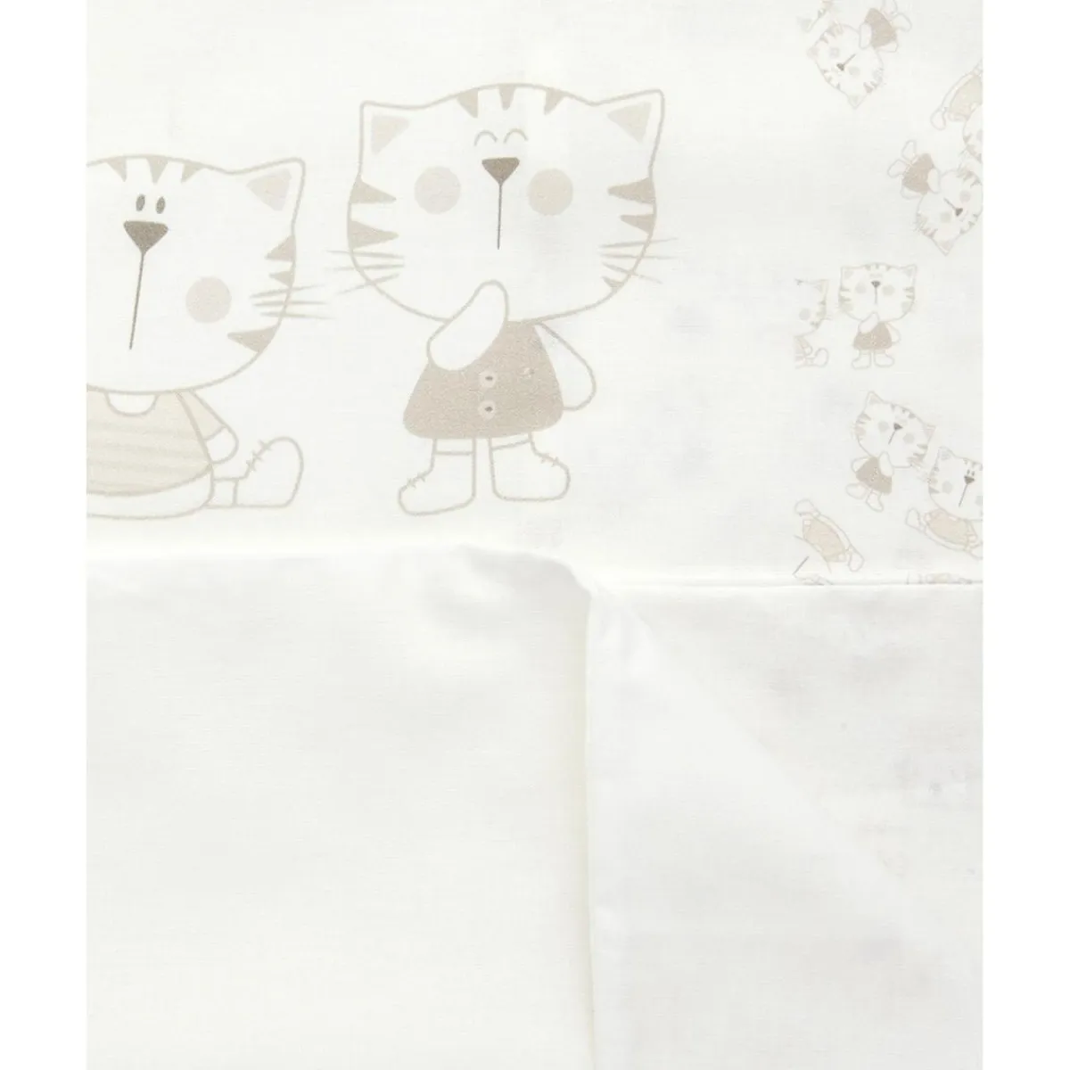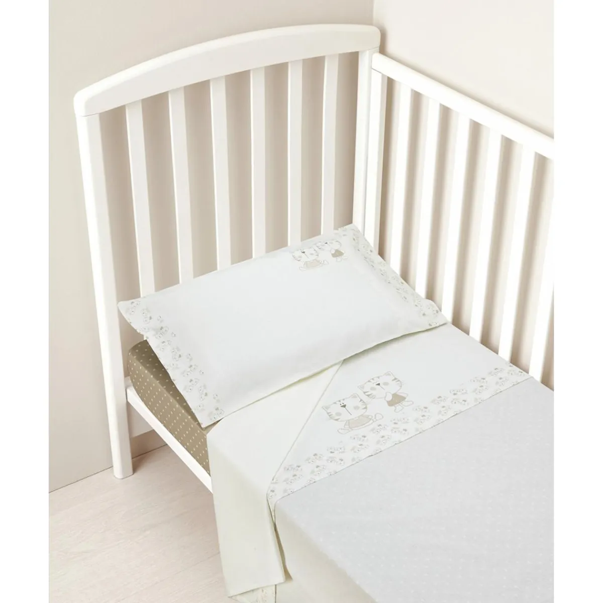 Este encantador juego de cama para cuna incluye una sábana encimera con divertidos animalitos estampados en el frente y un borde con el mismo diseño; una funda de almohada con bordes estampados en todo su contorno y una sábana bajera ajustable con un patrón de lunares beige.