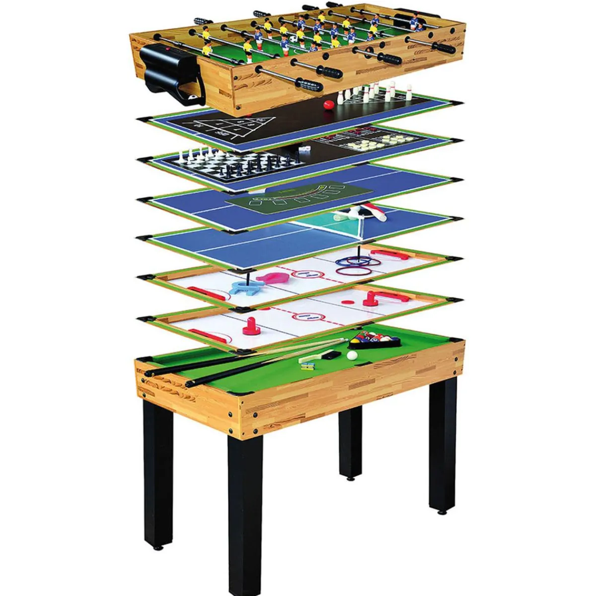 Esta mesa es de muy fácil manejo y montaje. Incluye los siguientes juegos: Futbolín, Billar, Ping-Pong, Push Hockey, Ice Hockey, Dados, Póker, Ajedrez, Anillas, Herradura, Backgammon y Bolos. Multijuego de fácil conversión juego a juego.