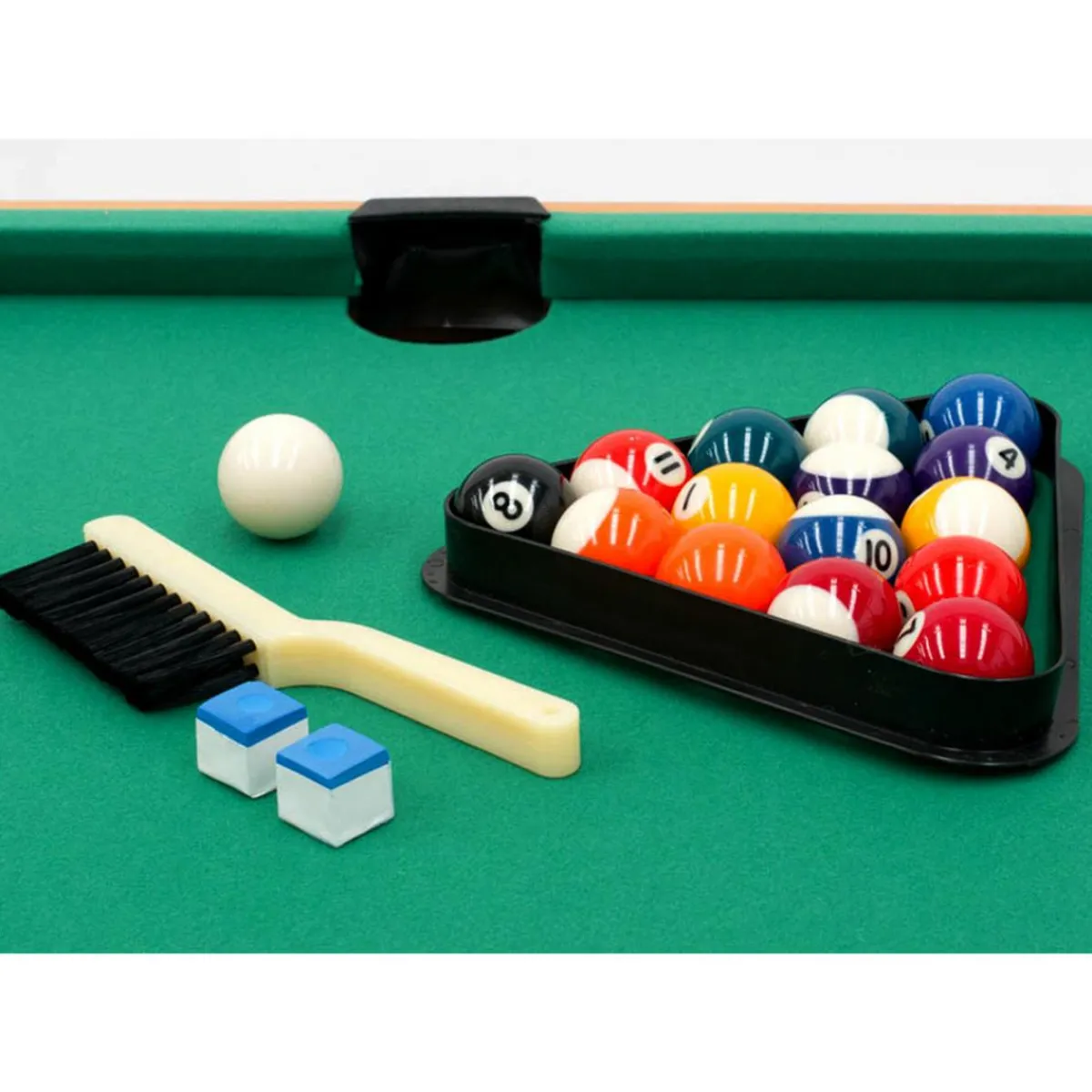 - Incluye: 2 tacos de billar, 1 juego de bolas (diámetro 3,8 cm), triángulo, cepillo, tiza, 2 bolas, 2 lanzadores, 2 discos, red, pelotas de ping pong, 2 palas de ping pong, 2 sticks, cartas, dados, fichas ajedrez, anillas, herraduras, bolos y fichas.