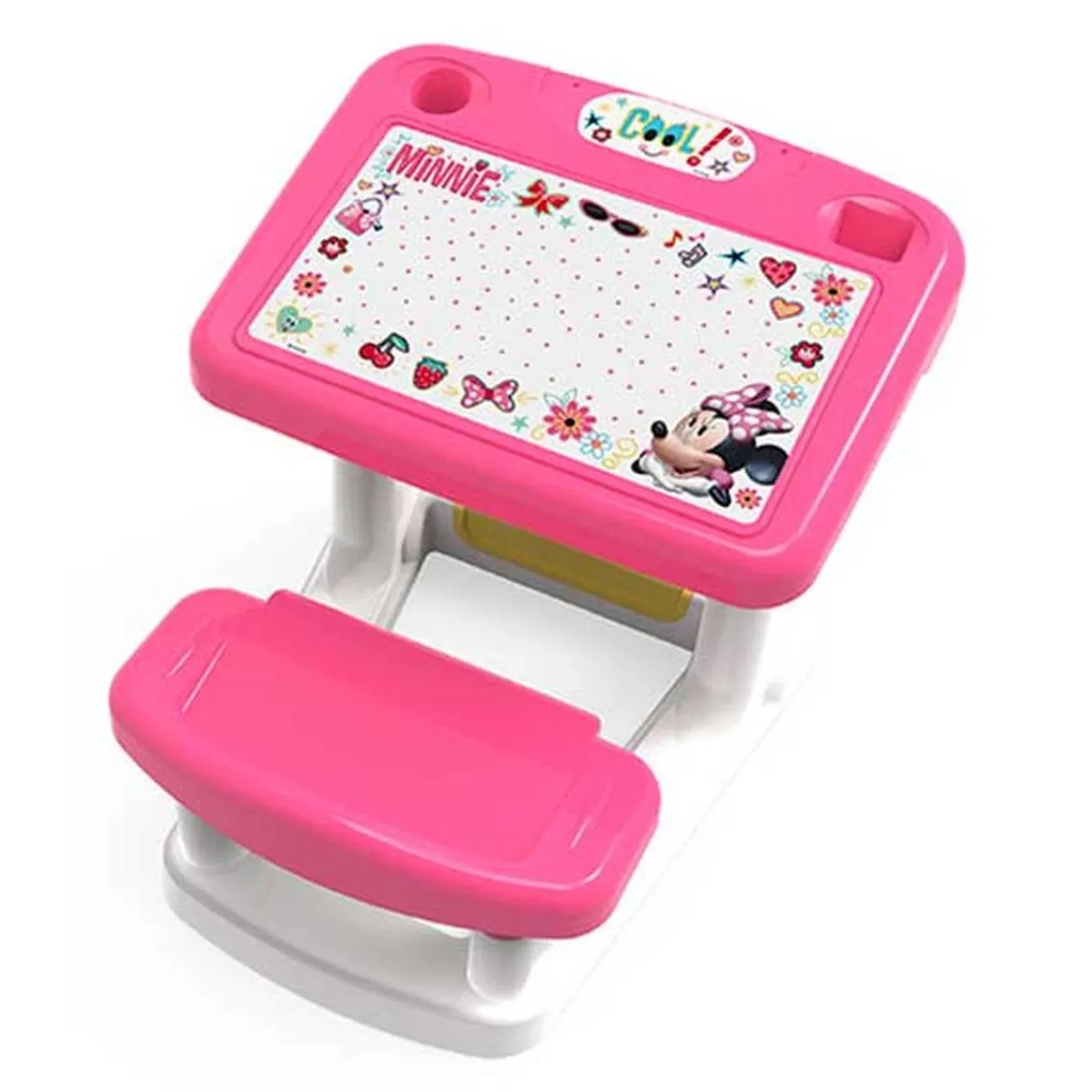 Pupitre infantil de Minnie para aprender, crear e imaginar sin límites. El pupitre incorpora una gran superficie de trabajo y compartimentos para guardar todo el material de dibujo y escritura. Se incluyen láminas de Minnie para colorear. Fabricado en plástico de gran resistencia y durabilidad, apto para niños y niñas a partir de 2 años.