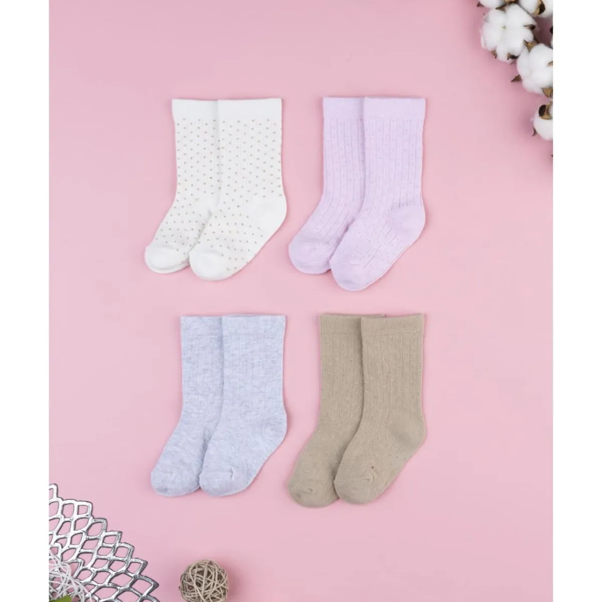Este pack incluye 4 calcetines altos en colores variados: crema, gris, rosa y marrón. Confeccionados con tejido suave y elástico, garantizan comodidad y calor, ajustándose bien sin oprimir.