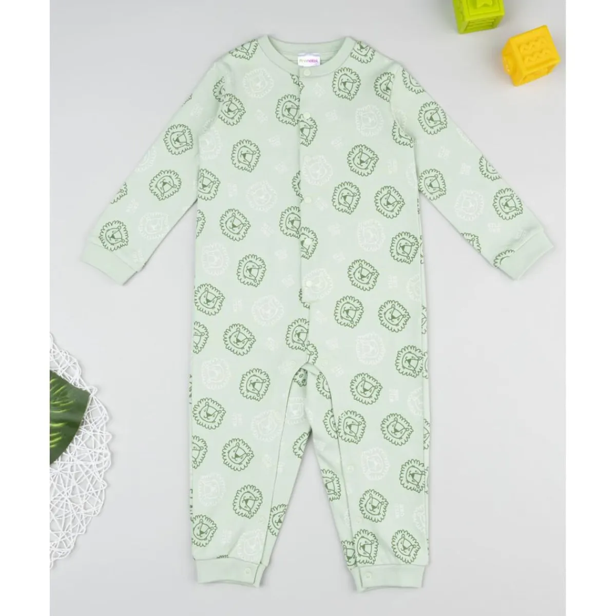 Pijama colorido para niño, en verde claro con estampado allover de leones. Cierre con botones automáticos en la parte delantera. Suave y cómodo para el descanso diario.