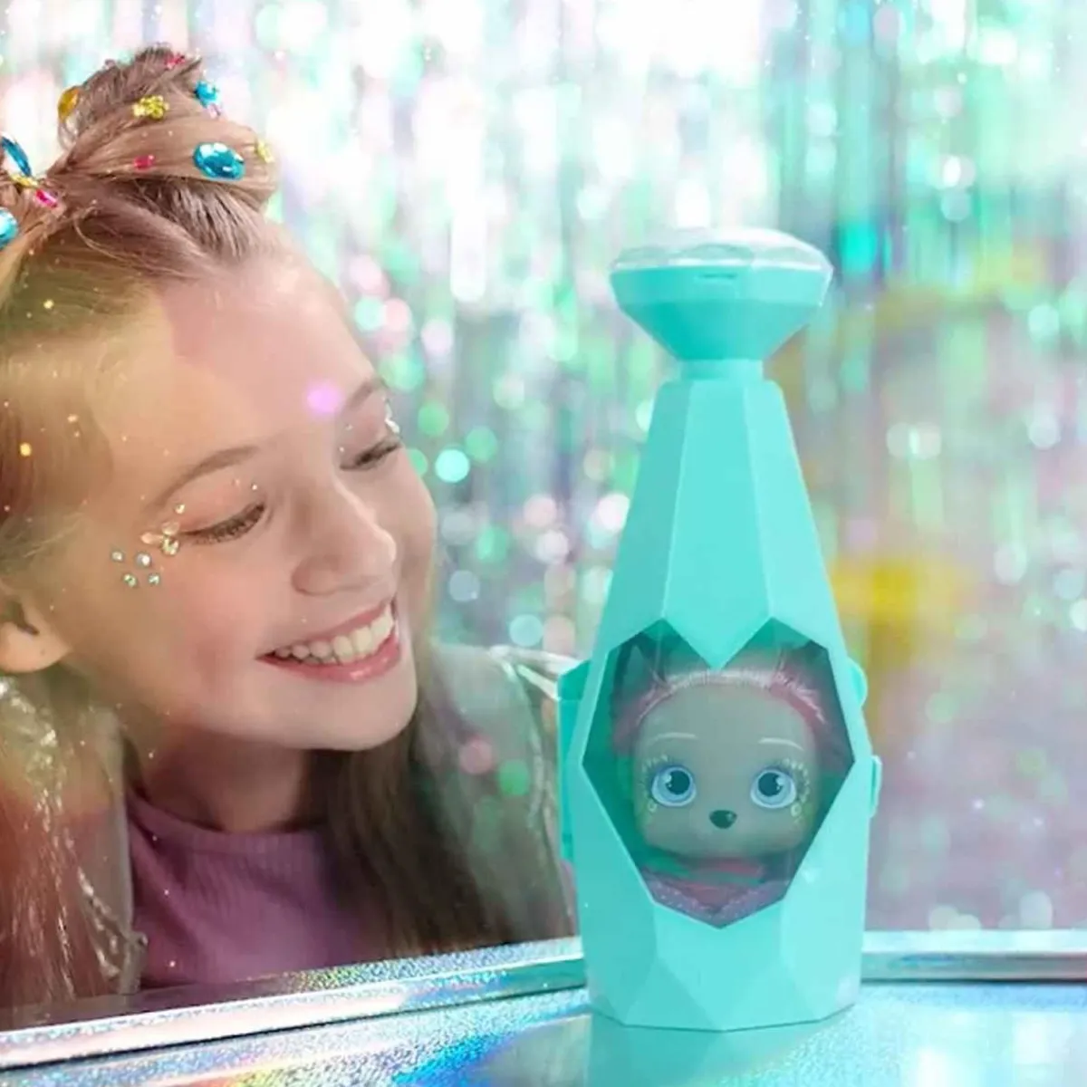 Esta muñeca VIP Pets Glam Gems viene en una nueva cápsula de champú con una gema de corazón. Toca el corazón de diamante y… ¡observa como la gema cambia de color! ¡Así podrás descubrir el personaje que se esconde dentro!