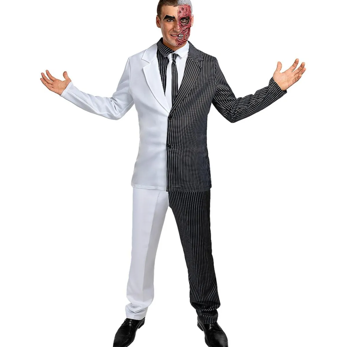Este disfraz en talla Standard es perfecto para encarnar a Dos Caras, el villano más ambivalente de Gotham. Consta de pantalón, chaqueta, camisa y corbata con diseño asimétrico, que representan la dualidad del personaje. La máscara y la moneda completan el conjunto, logrando un look escalofriante y auténtico.
