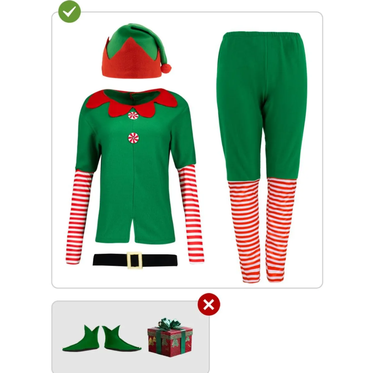 Este disfraz de elfa navideña para mujer en talla XXL incluye camiseta, pantalón, cinturón y gorrito, creando un conjunto alegre y original para las fiestas. Su diseño en colores verdes y rojos transmite diversión y el auténtico espíritu navideño.