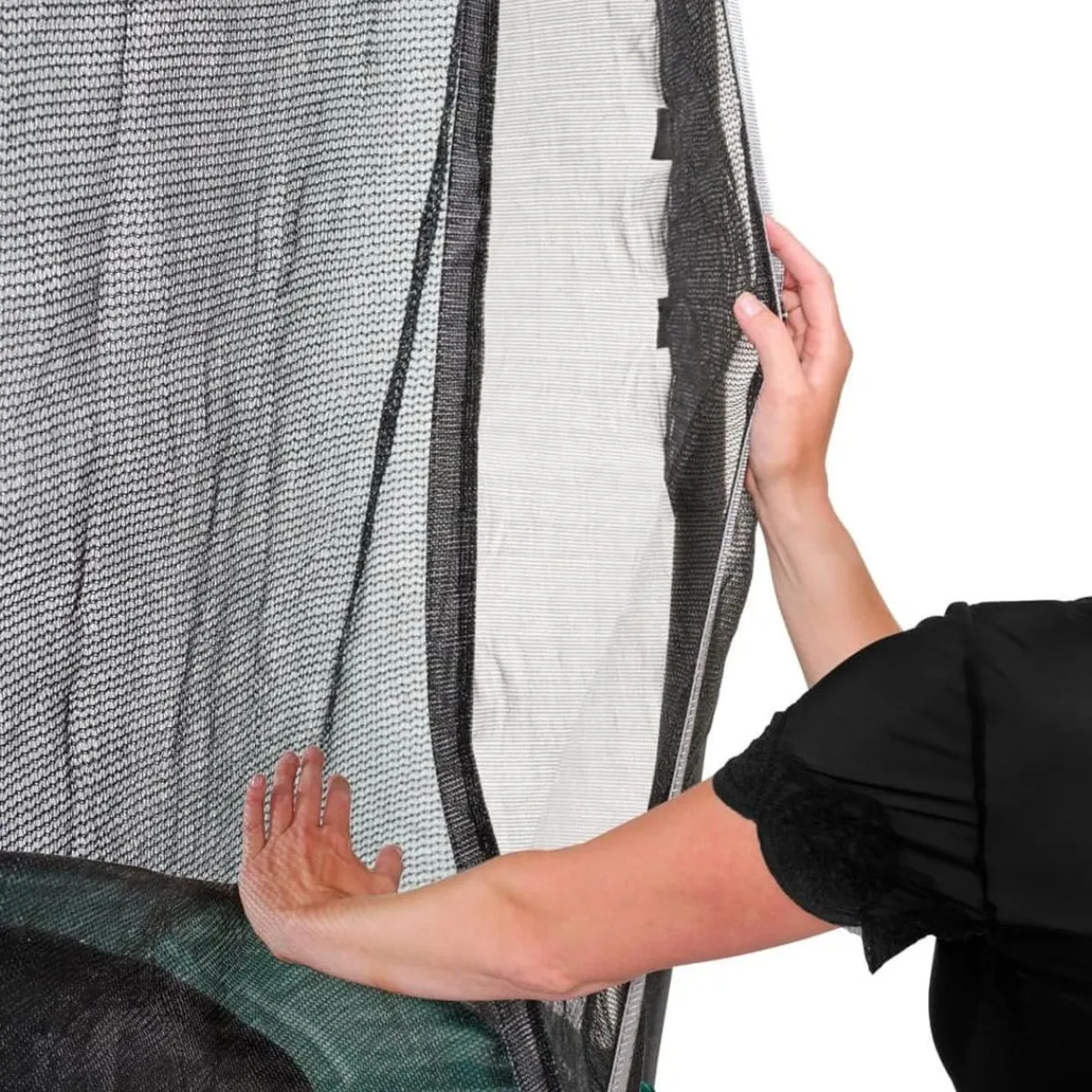 El trampolín también viene con una red de seguridad que tiene una solapa superpuesta que se cierra automáticamente, por lo que nunca se deja abierta sin ser notada. Los postes de la red de seguridad están cubiertos de espuma.
