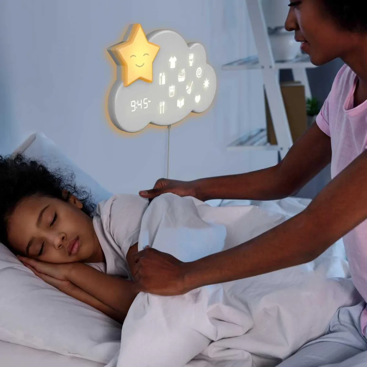 Es un ayudante interactivo 3 en 1 para colocar en la pared que incentiva el sueño relajado gracias a los sonidos que emite.