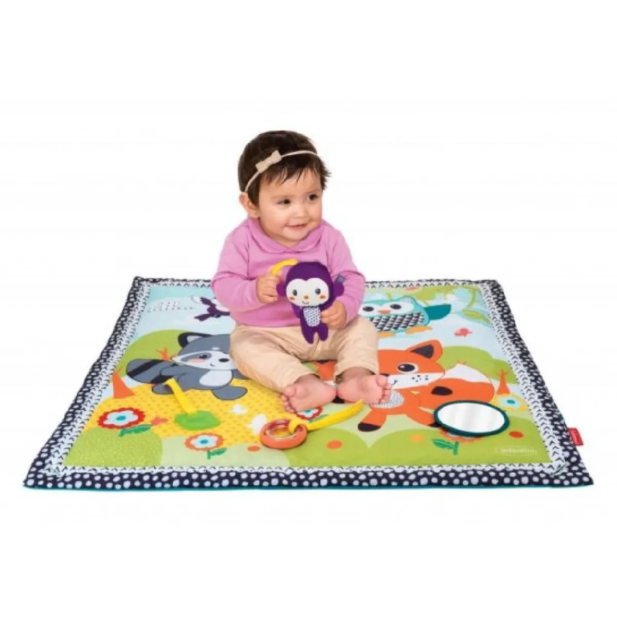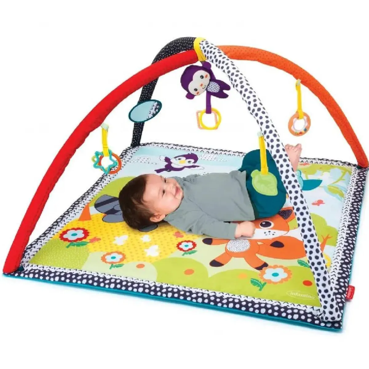 Este gimnasio-colchoneta con texturas y actividades tiene 5 juguetes separables para estimular al bebé: Un monito mordedor, rosquilla sonajero, espejo, hoja mordedor y anillas.
