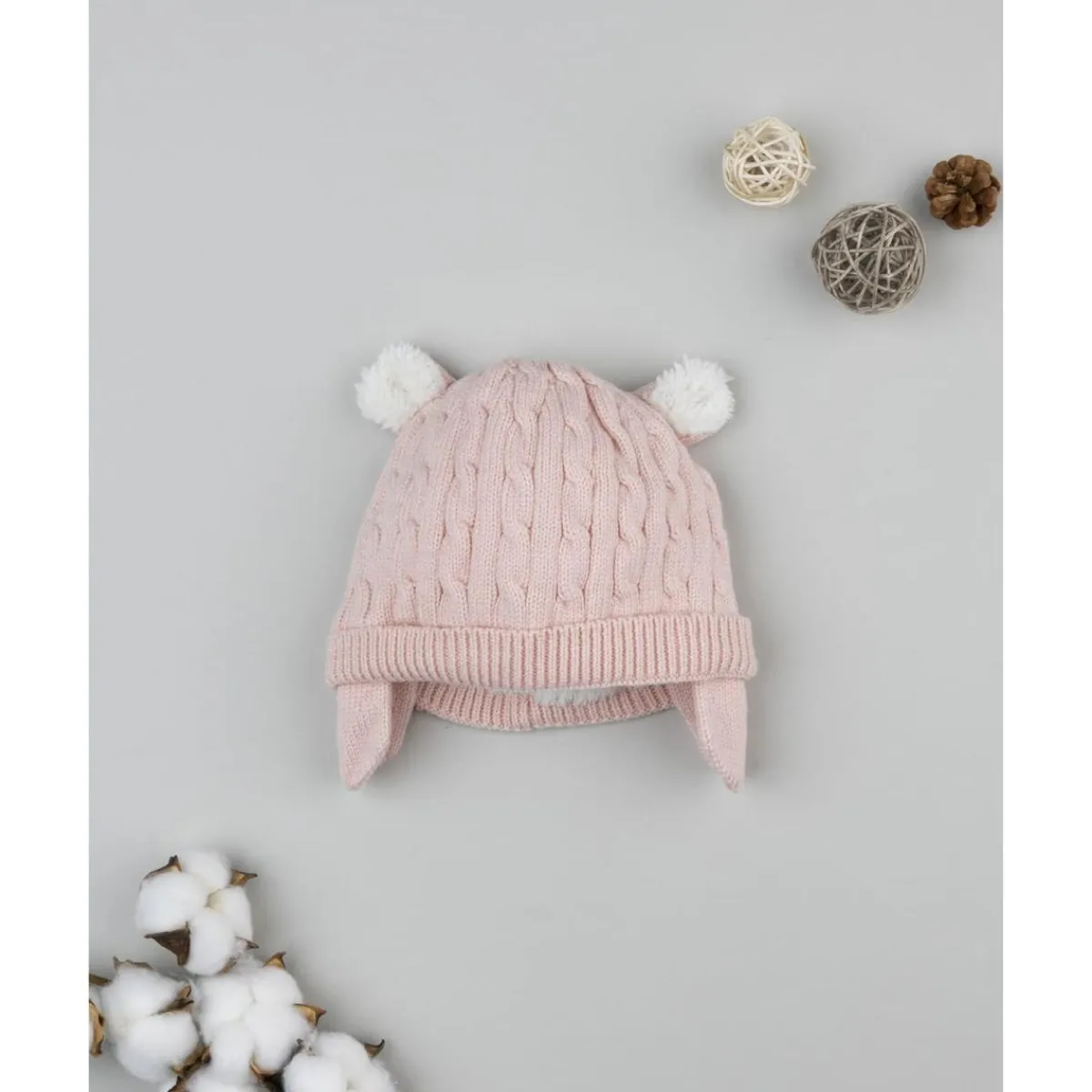 Este gorro infantil de punto en rosa pastel combina calidez y dulzura. Con diseño de orejitas aplicadas y cubreorejas integrados, protege eficazmente la cabeza y las orejas en los días fríos.