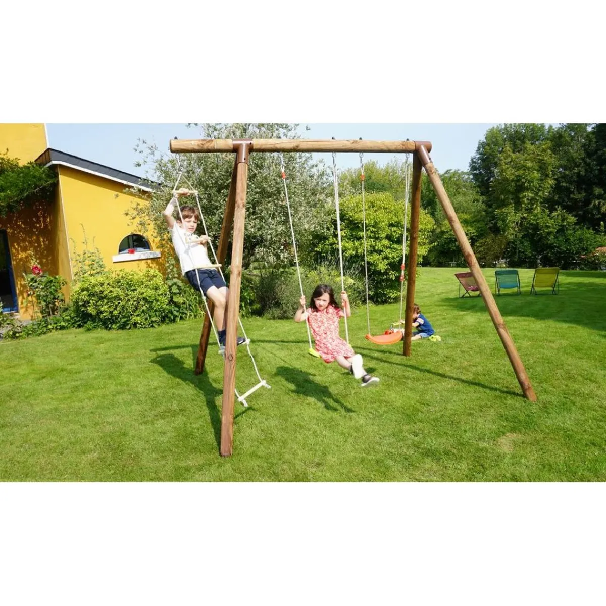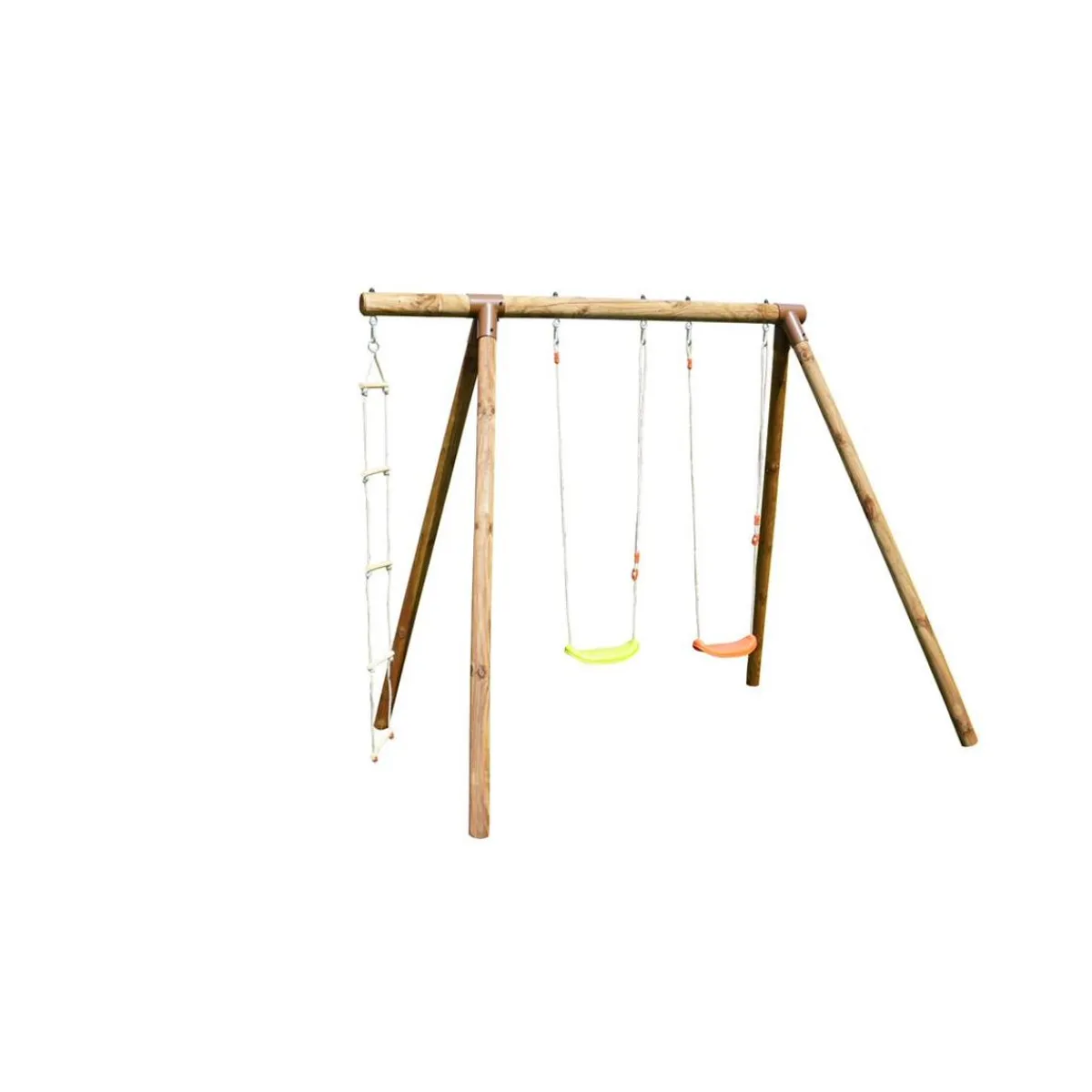 Se trata de un columpio de madera tratada con autoclave IV marrón. Es ideal para una casa con jardín, y para peques de 3 a 12 años.