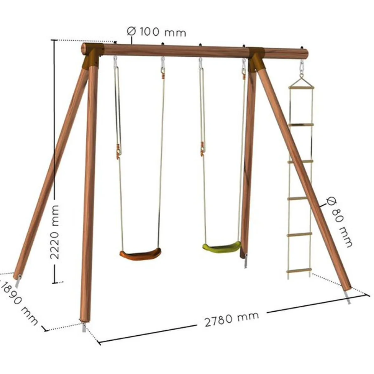 Incluye anclajes para el suelo, 2 asientos individuales, 1 escalera de cuerda con protección antipellizcos y anillas reforzadas.