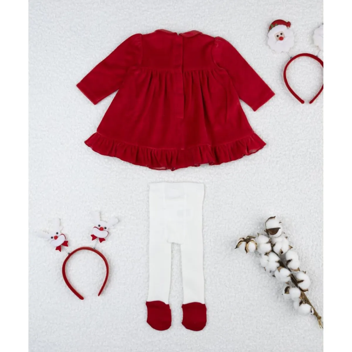 Encantador conjunto navideño para niña compuesto por vestido de felpa y leotardos a juego. De color rojo intenso con bordados festivos, es ideal para las celebraciones de invierno.