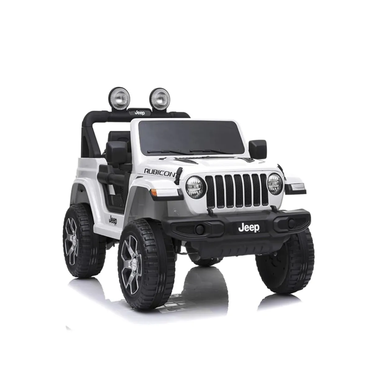 Jeep Wrangler Blanco Vehículo de batería. Para los súper apasionados del motor y la velocidad, os presentamos el coche eléctrico de la marca Jeep modelo Wrangler con licencia oficial de la icónica marca Jeep. Es un coche al que no le falta un solo detalle del vehículo original. Es de alta calidad y tiene una gran resistencia.