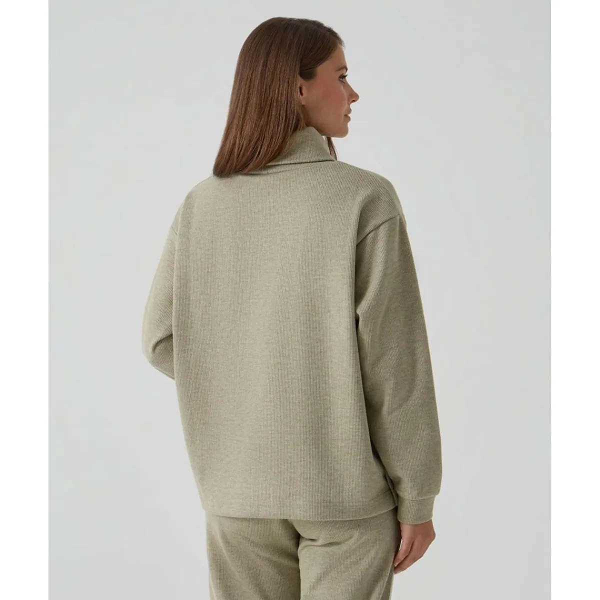 El jersey premamá verde “fake tricot” combina calidez y funcionalidad, acompañando a la futura mamá en todas las etapas del embarazo y la lactancia. Su tejido de punto suave y elástico se adapta cómodamente al cuerpo, mientras que las aberturas laterales con botones facilitan la lactancia. El cuello vuelto aporta un toque elegante y acogedor.
