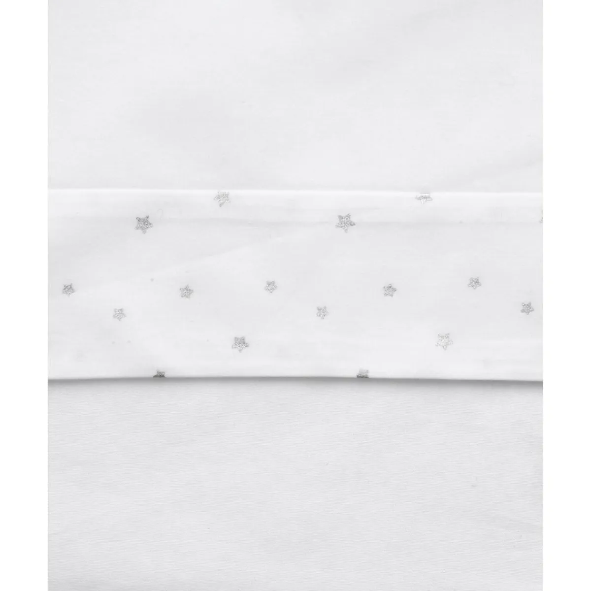 Este clásico juego de 3 piezas está confeccionado en algodón e incluye una sábana encimera blanca con bordes decorados con estrellitas plateadas brillantes y el bordado de dos ositos abrazándose junto a la inscripción «baby bears». La sábana bajera es de color blanco liso, mientras que la funda de almohada es blanca con un borde a tono decorado con estrellitas plateadas brillantes.