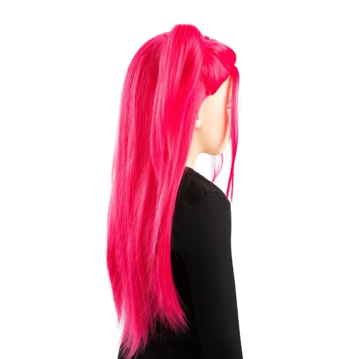 - Peluca de pelo sintético rosa intenso con raya al centro.