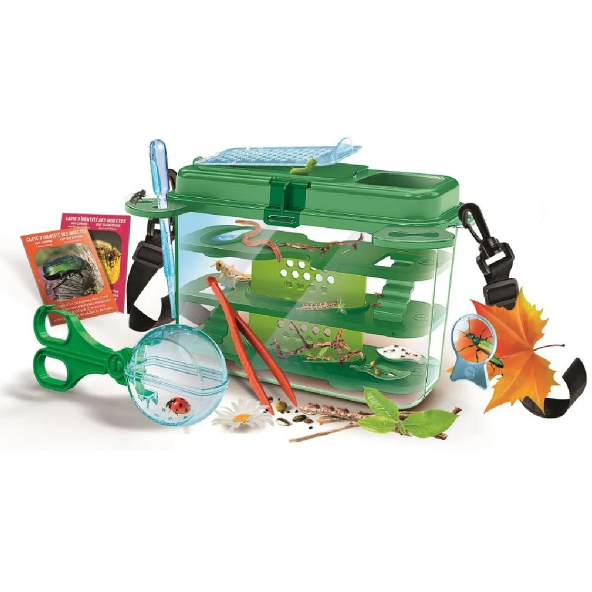 El kit incluye una caja de fauna transportable con estantes, pinzas, una lupa, recipientes, tijeras para capturar insectos y una correa para el hombro. Los estantes de la casa vienen desmontados, ofreciendo una actividad adicional al montar el refugio para los insectos. Además, las tarjetas didácticas y el manual ilustrativo proporcionan información valiosa que ayudará a los pequeños a convertirse en especialistas en insectos.