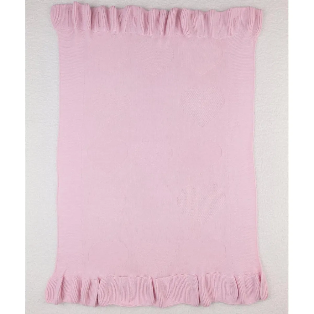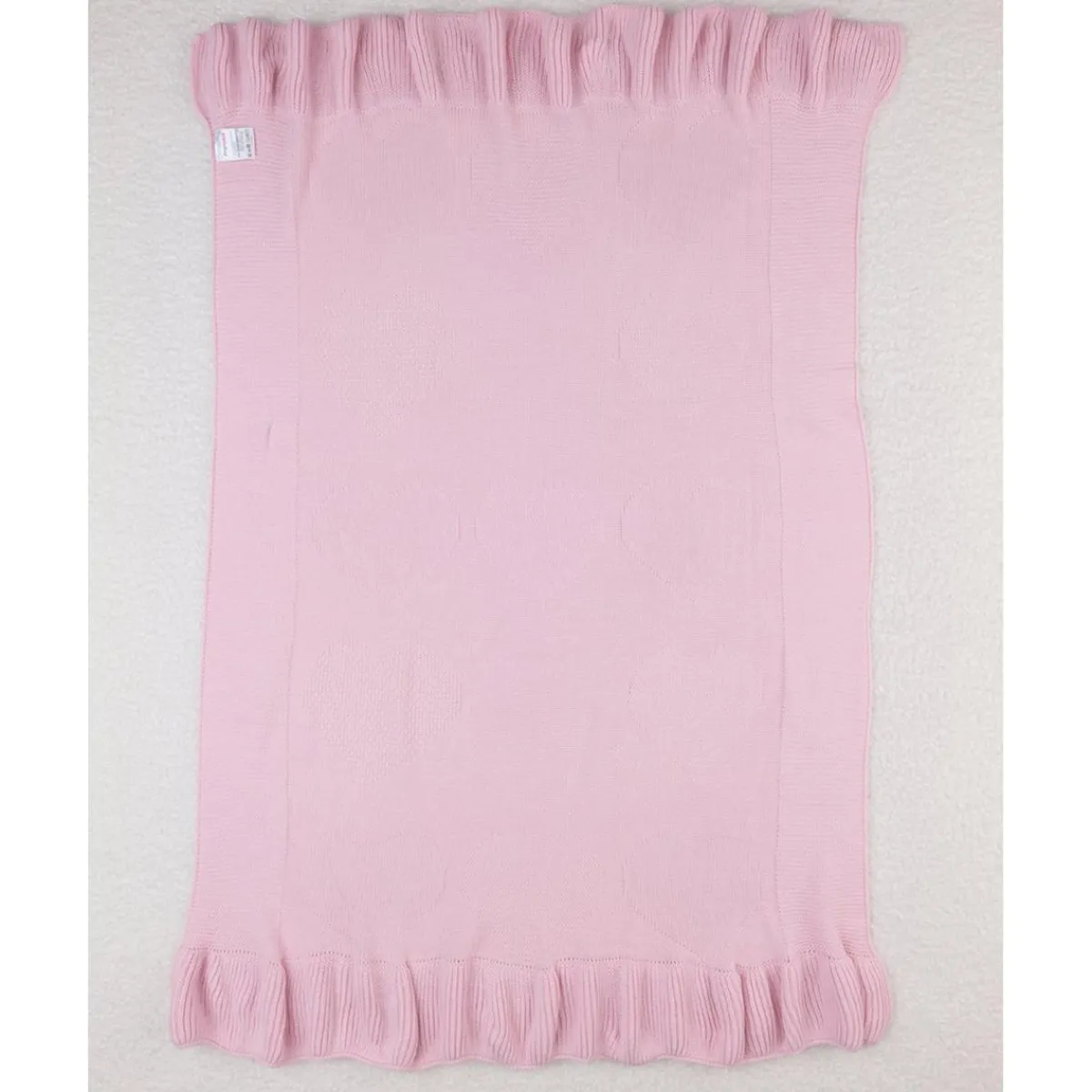 Esta encantadora manta en tono rosa está confeccionada en hilo de alta calidad y adornada con volantes en los bordes, además de un bordado tonal de grandes corazones, aportando calidez y estilo al espacio de tu bebé.