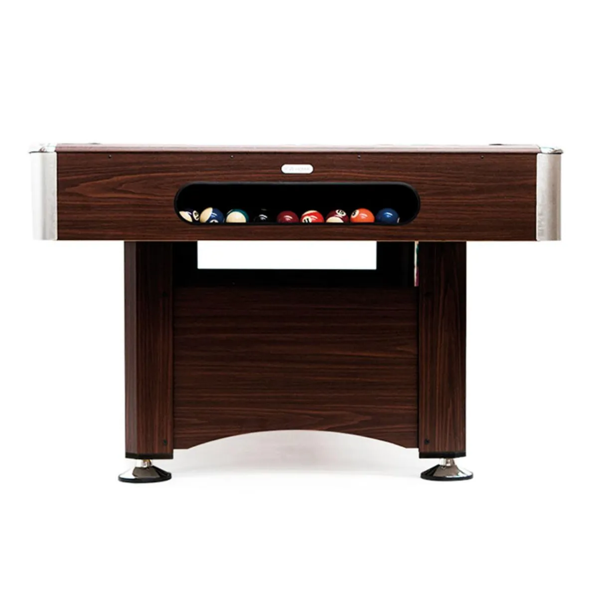 El billar cuenta con sistema de retorno de bolas. Incluye todos los accesorios para empezar a jugar al billar: 1 Juego de bolas (diámetro 5,72 cm), 2 tacos (144,78 cm), triángulo, tiza y cepillo. Medidas de la mesa: 221 x 122 x 81 cm. Medidas del campo de juego: 198,5 x 99,5 cm. Peso: 117 kg.