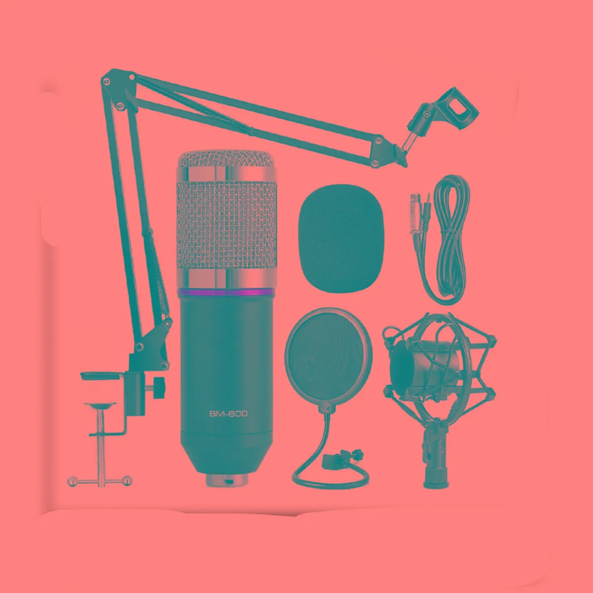 - Incluye un micrófono BM-800, amortiguador, filtro de ruido, montaje de micrófono ajustable, soporte de brazo, parabrisas, cable de alimentación y tarjeta de sonido.