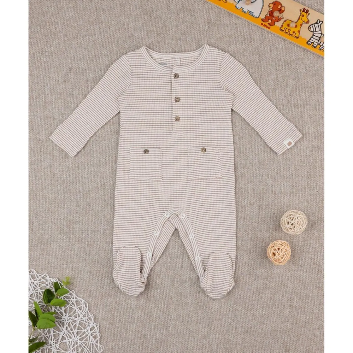 Tierna pijamita de bebé. La prenda se presenta en una sola pieza con zapatillas coordinadas y se desarrolla en beige total con estampado de bolsillos de parche y falsos botones de ojal marrones. El ajuste es suave y práctico gracias a los botones automáticos en la entrepierna. La prenda es de algodón oeko-tex, probado para sustancias nocivas garantiza alta seguridad. Accesorios no a la venta. El paquete contiene solo la prenda de vestir.