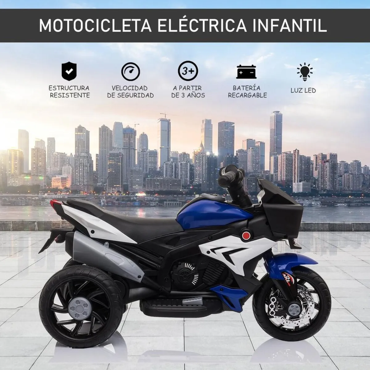 Homcom – Moto eléctrica batería 3 ruedas Trimoto Negro y Azul. ¡Qué empiece la aventura! Esta motocicleta eléctrica de Homcom con 3 ruedas será la compañera de aventuras perfecta para cualquier niño. Con una autonomía de hasta 45 minutos después de una carga completa, podrá ir por sus lugares favoritos como un verdadero conductor y a una velocidad limitada de seguridad de 3 km/h. Con faros delanteros con luz, esta moto ofrece una experiencia de conducción de lo más realista, para que los niños se lo pasen en grande.
