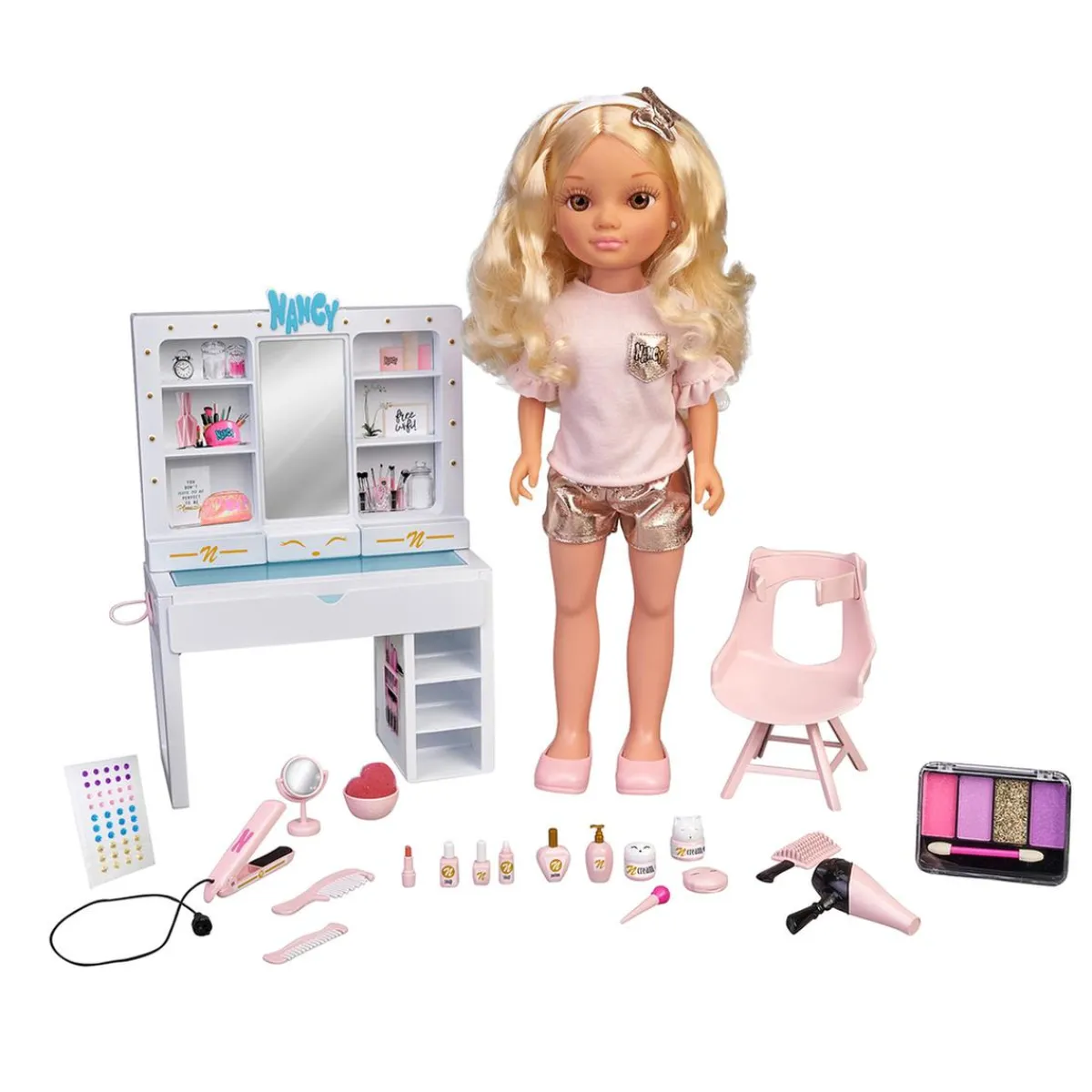 Esta muñeca Nancy viene con un tocador lleno de accesorios y una butaca con soporte para que quede sujeta mientras la peinas o maquillas.