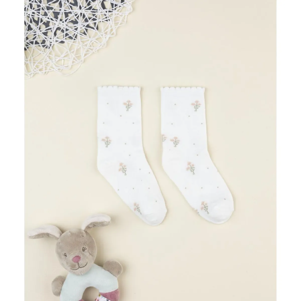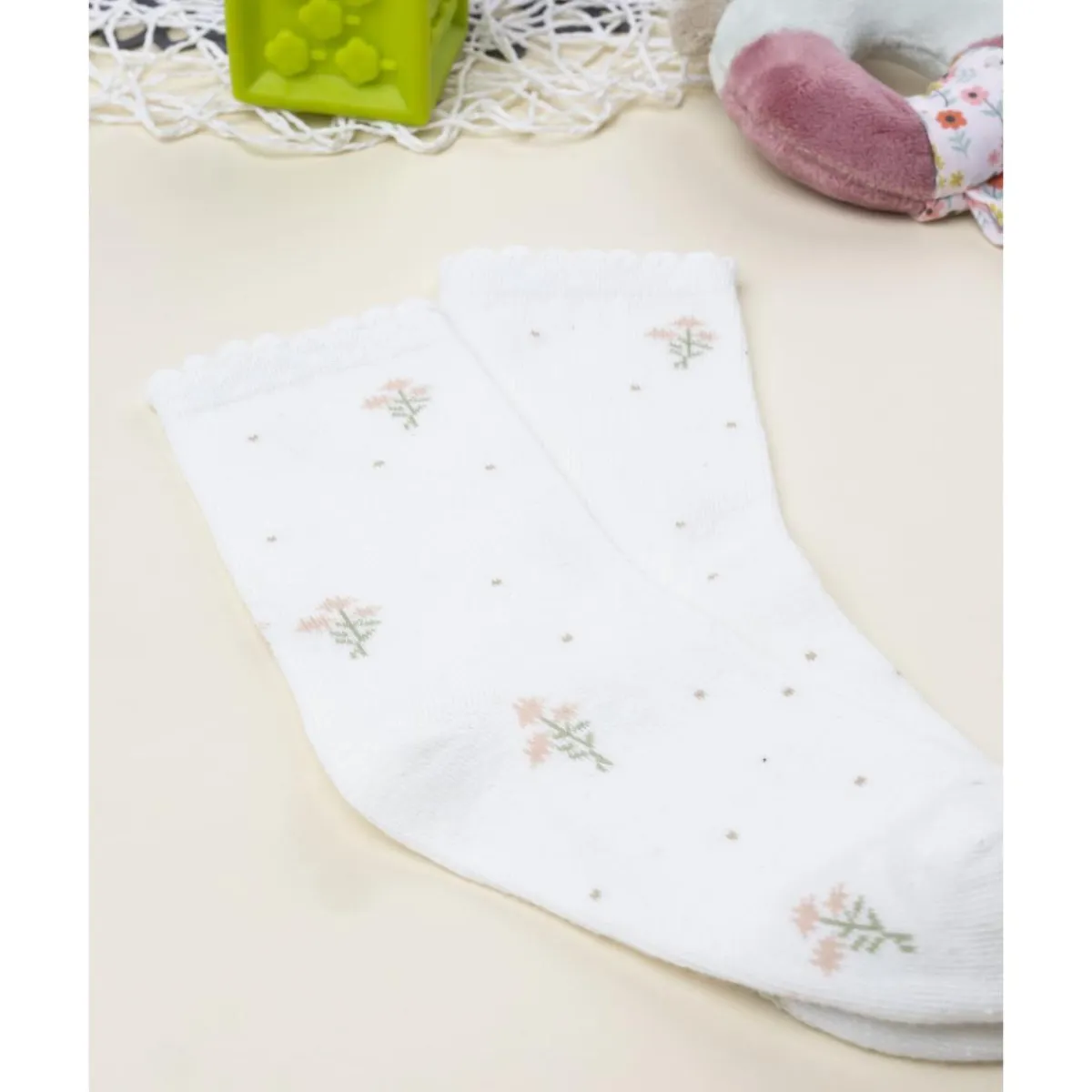 Delicados calcetines para niña en color blanco con bordados florales allover. Su tejido suave y el acabado decorativo en el tobillo los hacen perfectos para añadir un toque elegante a cualquier conjunto.